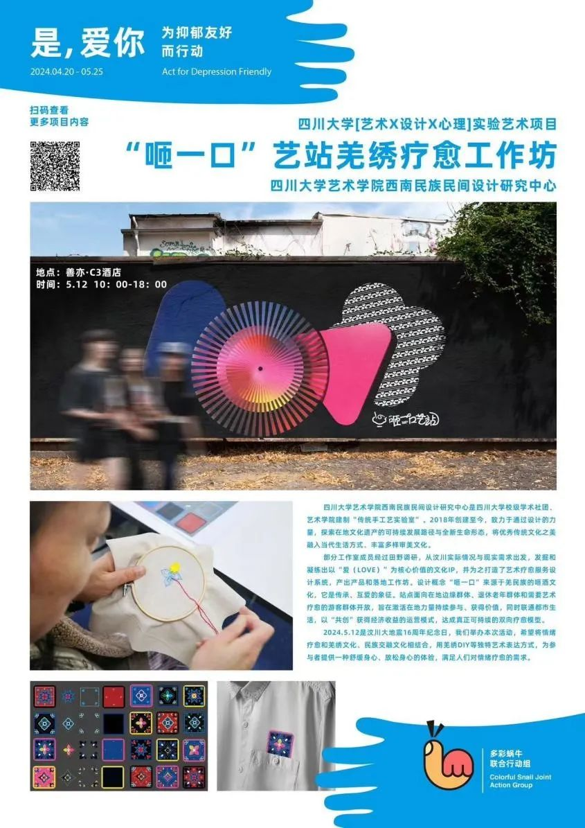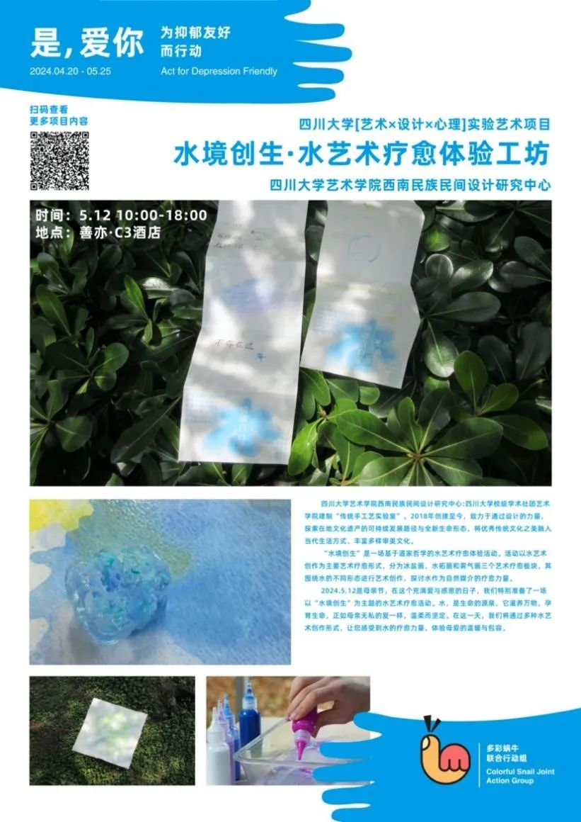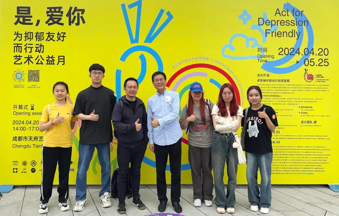 四川大学艺术学院设计与媒体艺术系近年来在艺术与医学的跨学科研究领域持续深耕,系主任许亮副教授、王莉莉副教授、蔡端懿老师带领着艺术与医学健康设计跨学科本硕学生团队参与了一场特别的艺术公益之旅——“是,爱你”为抑郁友好而行动艺术公益月活动,这一活动由多彩蜗牛联合行动项目组发起,汇聚了四川大学“艺术x设计x心理”跨学科联合实践项目、武侯区玉林东路社区、成都市未成年人心理成长中心、成都爱有戏社会工作服务发展中心、成都a4美术馆和成都好奇学习社区等多个机构的力量,共同致力于打造关注心理健康、支持抑郁群体的平台。此次活动在艺术与社会层面上产生了积极反响,引发了更多人对心理健康议题的广泛关注和深入思考。