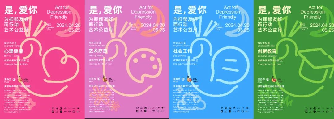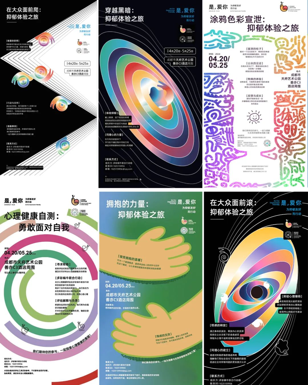 活动形象以“蜗牛、我牛”为主题,为“是,爱你—为抑郁友好而行动”艺术公益月活动创意设计了多彩蜗牛形象,巧妙地将蜗牛与竖起大拇指的手势相结合,传递出坚韧、力量、希望以及自我接纳和成长的积极信念。