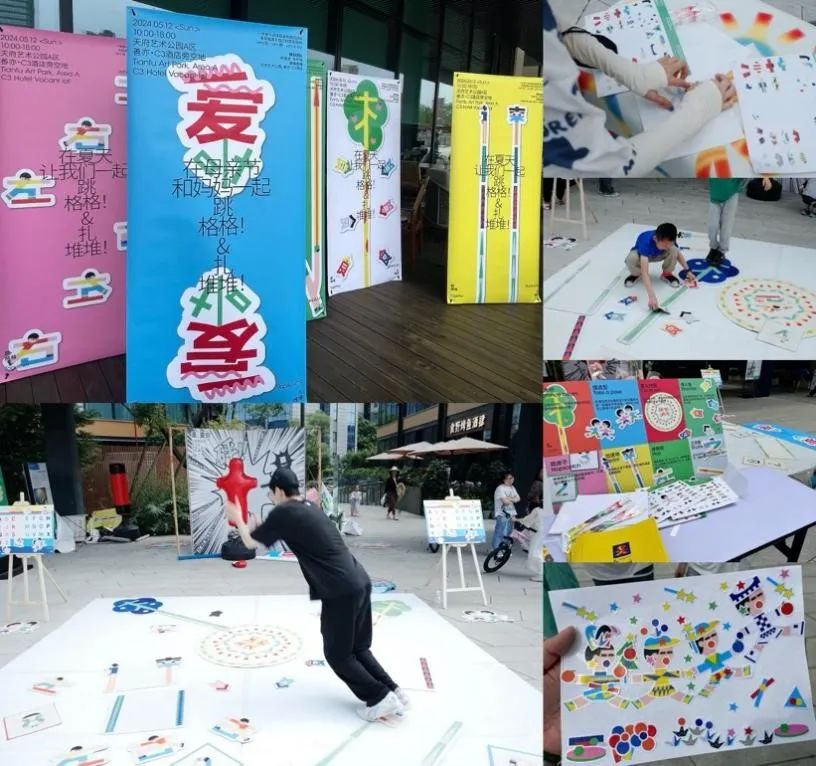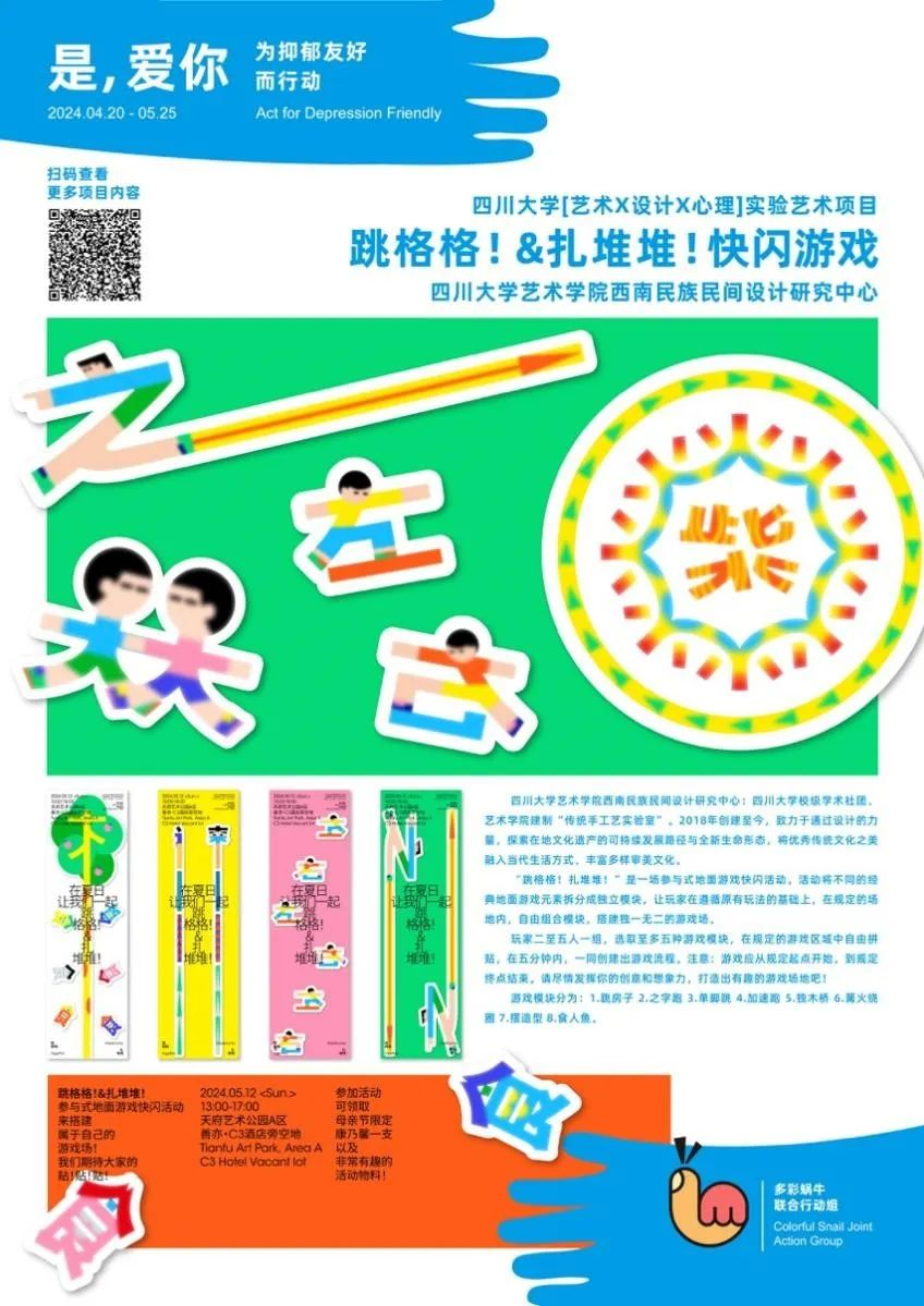“跳格格!扎堆堆!”是一场参与式地面游戏快闪活动,是我院视觉传达设计专业2024届本科毕业设计作品之一。活动将跳房子、之字跑、篝火绕圈、食人鱼等经典户外地面游戏元素拆分成独立模块,让玩家二至五人一组,选取至多五种游戏模块,在原有玩法的基础上,于规定游戏区域中自由拼贴,并共同创建出游戏流程,形成独一无二的游戏场。活动以参与式设计的方式,让人们走出房门,放下手机,回归线下,重新感受人与人之间的温度、重建现实的链接。游戏开展日适逢母亲节,成员们也为这一天设计了特别的视觉形象,欢迎大家带着自己的妈妈来共同参与。