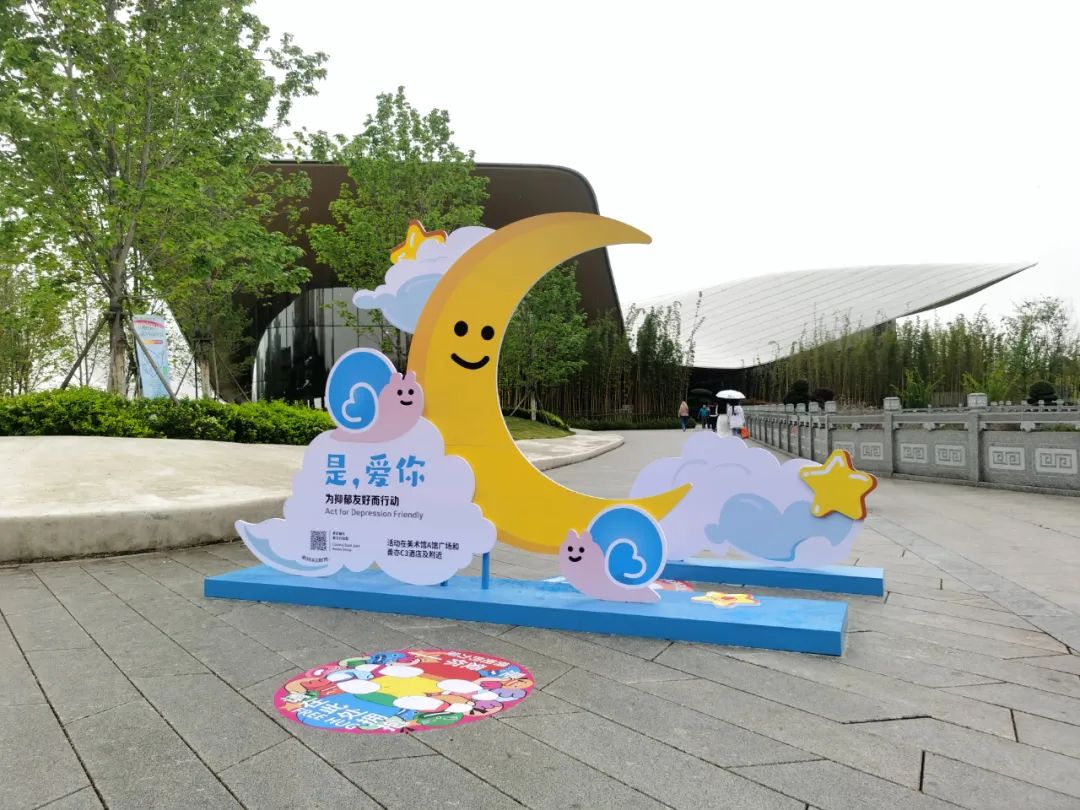 由蜗牛和月亮构成的艺术装置为公众提供了一个与活动打卡合影的空间,形象象征着坚韧和耐心,鼓励人们在面对抑郁时保持坚定和不屈不挠的精神;月亮则代表着夜晚的宁静与神秘,提示我们在黑暗中寻找光明和希望,传递出一种温暖和治愈的力量,旨在唤起公众对抑郁群体的同理心,鼓励人们积极参与到心理健康的促进活动中,共同构建一个更加友好的社会环境。