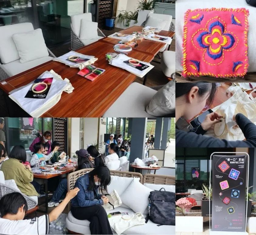 “‘咂一口’艺站羌绣疗愈工作坊”的设计来源于四川大学艺术学院西南民族民间设计研究中心。成员们经过田野调研,从汶川实际情况与现实需求出发,打造出一个以“爱”为核心的艺术疗愈服务设计系统。设计概念“咂一口”来源于羌民族的咂酒文化,它是传承、互爱的象征。站点面向在地边缘群体、退休老年群体和需要“艺术疗愈文化体验”的游客群体开放,旨在激活在地力量持续参与、获得价值,同时联通都市生活与设计师群体,以“共创”获得经济收益的运营模式,达成可持续的“双向”疗愈模型。活动开展当天的5月12日也是汶川大地震16周年纪念日,活动小组希望能够通过将艺术疗愈和羌绣文化相融合的方式,为来自都市空间的参与者提供一种舒缓情绪、放松身心的体验。在创作过程中,参与者们不仅能够感受到羌绣跳跃色彩与肌理中蕴含的生命力量,也会通过完成一件小的刺绣作品来收获或传递一份爱与喜悦。