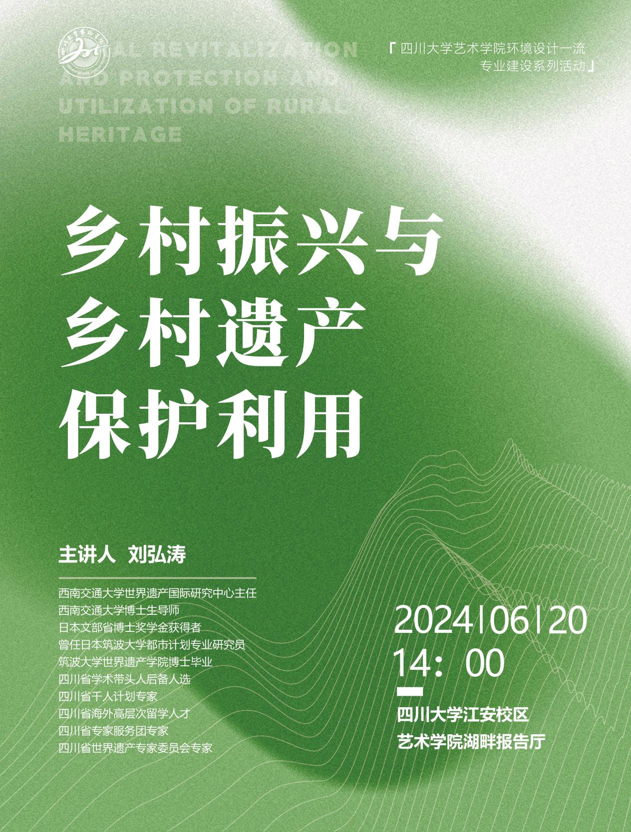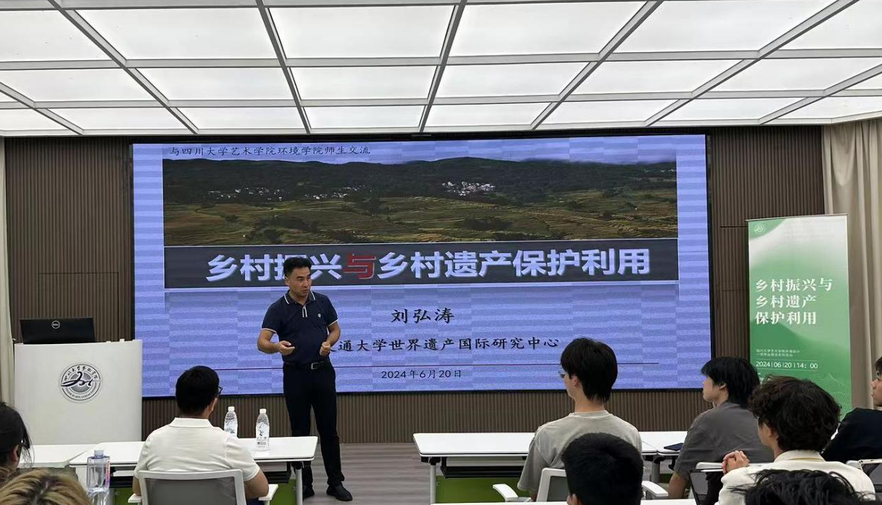 2024年6月20日,环境设计一流学科建设系列讲座——《乡村振兴与乡村遗产保护利用》在四川大学江安校区艺术学院湖畔报告厅举行。此次讲座以环境艺术设计专业在乡村遗产方面的保护利用为主题,对乡村遗产价值进行了深度的讲解和讨论,为乡村振兴中乡村遗产文化注入新时代的活力与动力。本次会议由西南交通大学世界遗产国际研究中心主任刘弘涛作为主讲嘉宾,环境设计系本科与研究生各年级同学参加了本次精彩的讲座。