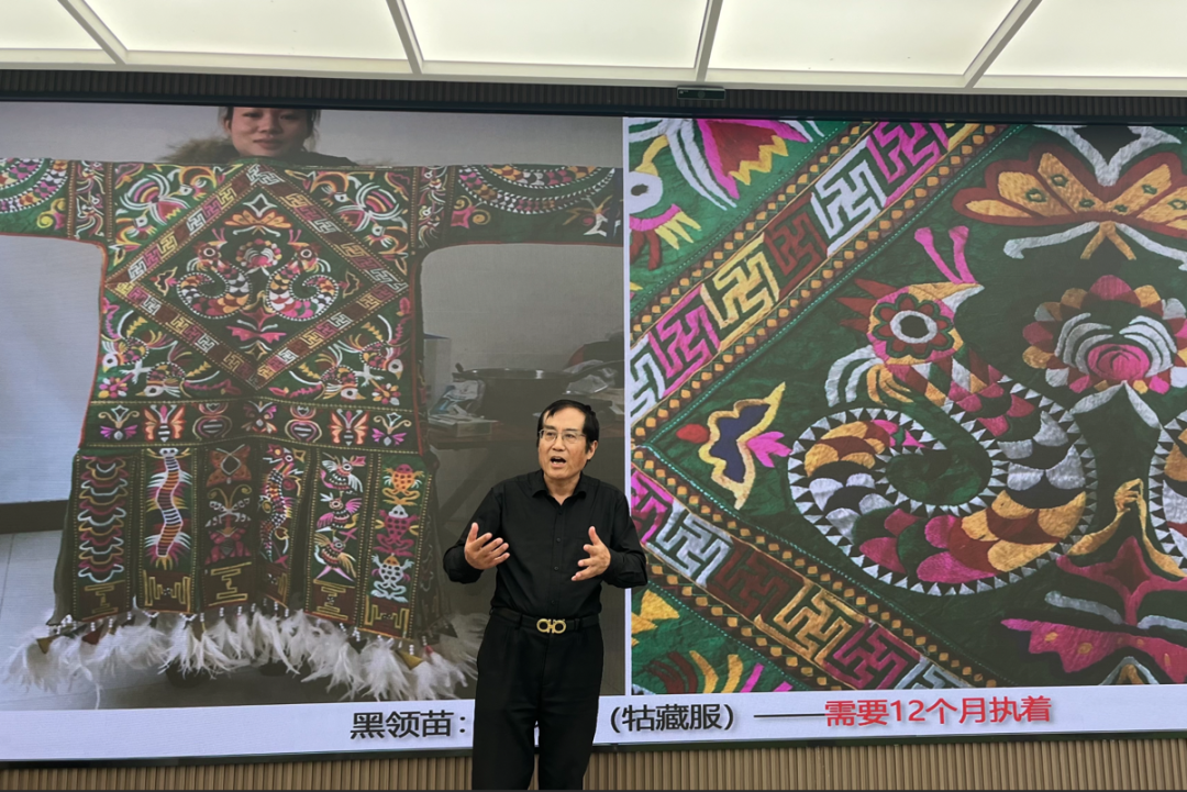 在7月4日下午举行的第四讲《非遗智慧与艺术审美》中,贾教授结合自身长期的田野调查经验,从非遗与物遗的概念、非遗中的造物精神、非遗中的艺术智慧与非遗中的生活审美四个方面展开讲授。首先,贾教授对非遗与物遗的概念、关联性、不同点进行了界定与阐释。其次,贾教授图文并茂向我们展示了少数民族耗时数月乃至数年制作的服装,他指出非遗在传承守正、活化创新、产品开发中的应用,需要秉承其造物精神。此外,还应学习非遗中如环保、图案与工艺技巧、生态农业与居住的艺术智慧。最后,贾教授向我们展示了瑶族与苗族服饰的奇特多样、识别凝聚、图案造型、巧夺天工之美,总结出非遗中的审美观是物质追求与精神表达的双重体现。设计与媒体艺术系蔡端懿老师对讲座进行了总结。