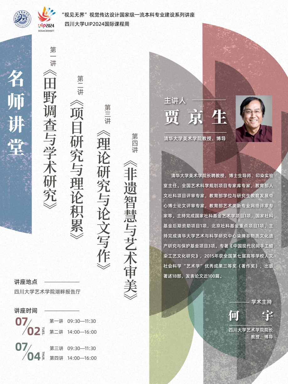 近日,四川大学uip2024国际课程周贾京生教授“名师讲堂”暨“视见无界”视觉传达设计国家级一流本科专业建设系列讲座于湖畔报告厅顺利举行。此次活动邀请到清华大学美术学院长聘教授、博士生导师、印染实验室主任贾京生教授,为设计专业师生带来为期两日、题目为《田野调查与学术研究》《项目研究与理论积累》《理论研究与论文写作》《非遗智慧与艺术审美》共四讲的学术盛宴。此次讲座由艺术学院院长何宇教授担任学术主持,设计与媒体艺术系系主任许亮副教授主持。