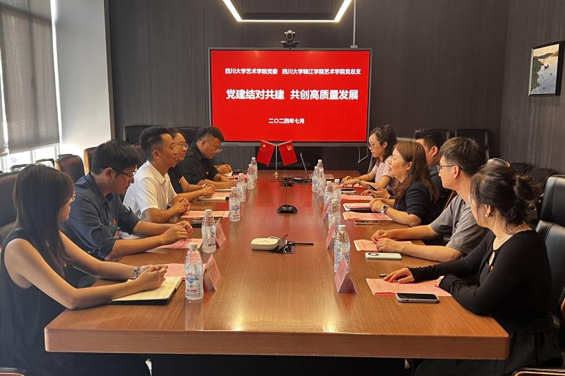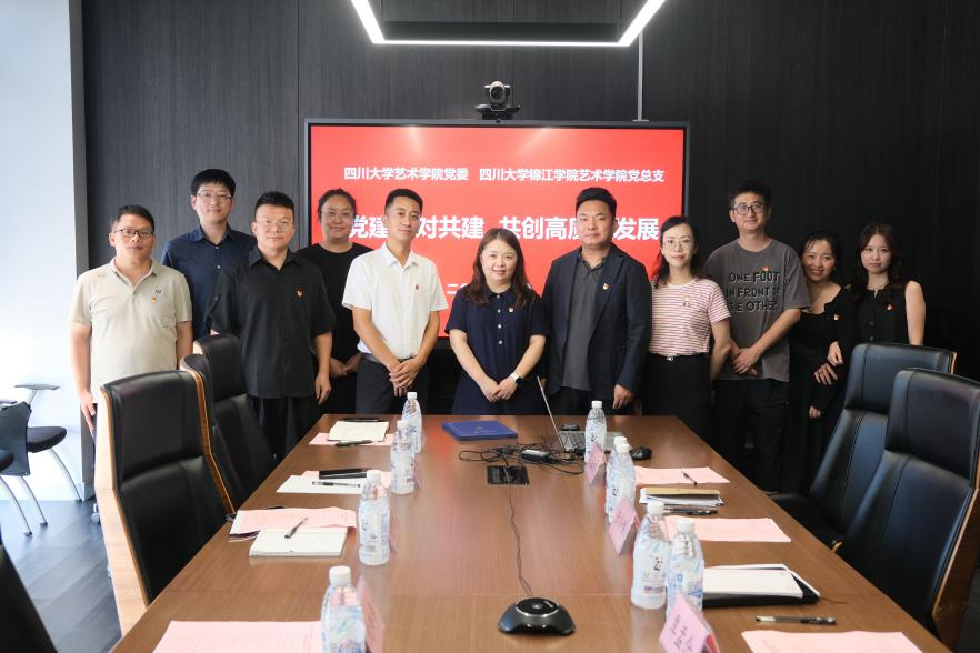 2024年7月12日下午,锦江学院艺术学院党总支副书记沈洪春一行赴四川大学艺术学院开展党建结对共建签约仪式,四川大学艺术学院党委书记覃孟念、副院长张令伟、专职组织员、党政办主任以及党支部书记代表出席签约仪式。