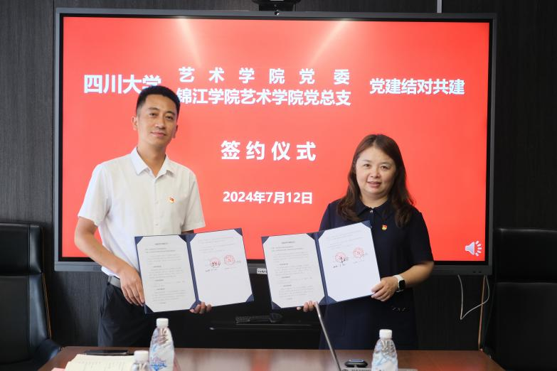 随后,四川大学艺术学院党委与锦江学院艺术学院党总支正式签署了党建结对共建协议,标志着两校在党建工作上迈出了坚实的步伐,也为未来的深入合作奠定了坚实基础,将推动两校在教学、科研、学生工作等方面的共建合作,实现党建质量和育人成效的相互融合、共同提升。