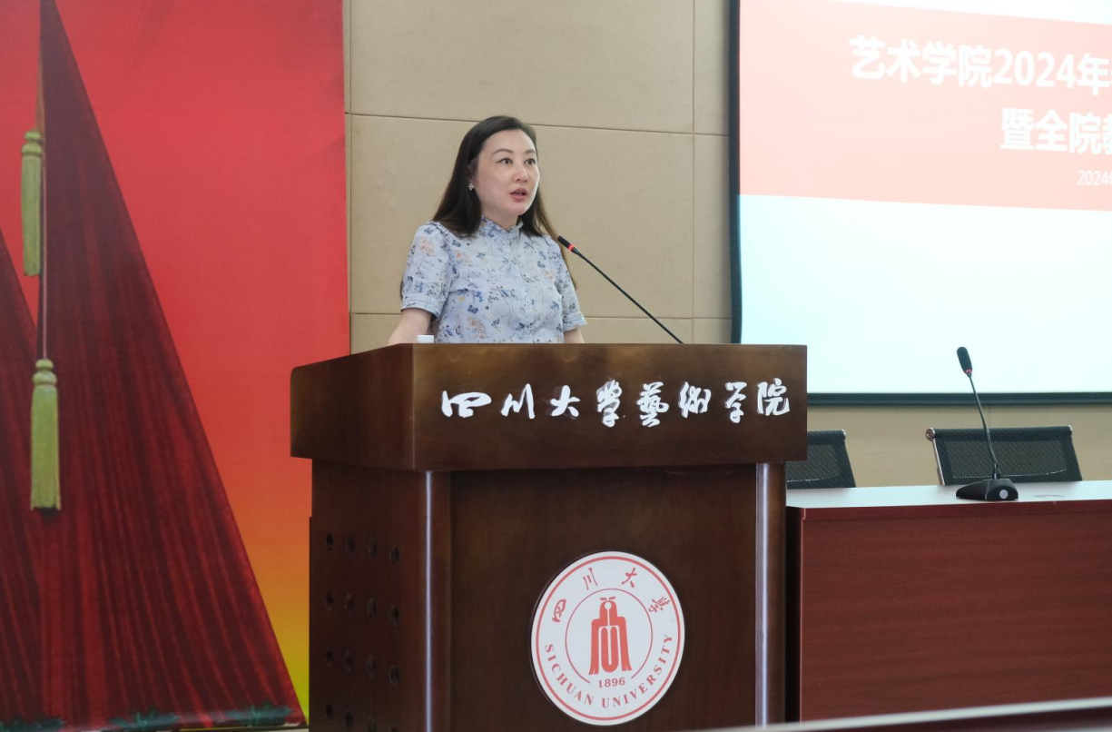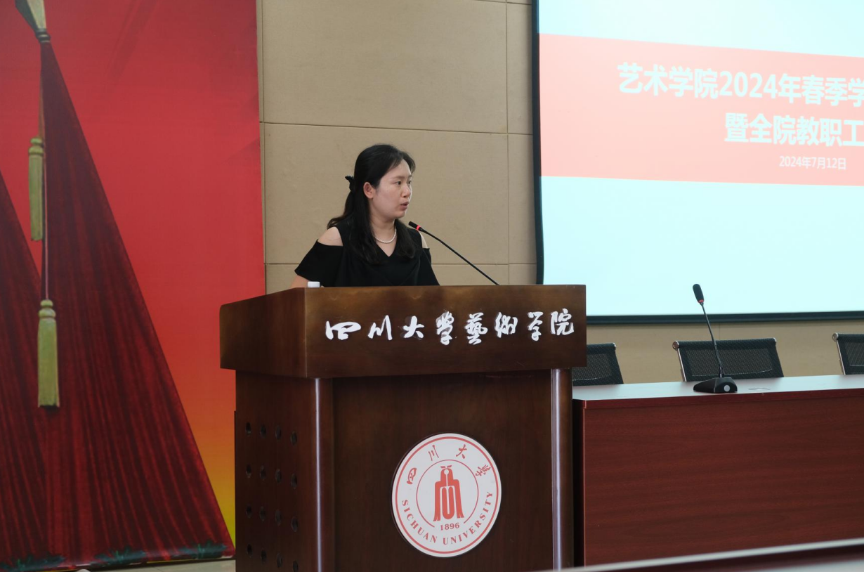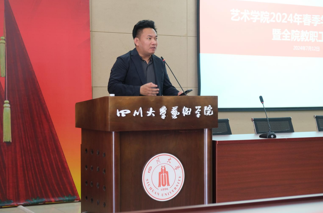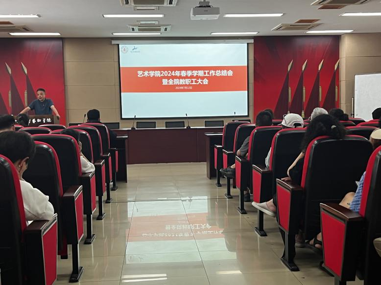 2024年7月12日,艺术学院在a1-11召开春季学期工作总结会暨全院教职工大会,学院领导班子成员和全体教职工参加会议,会议由艺术学院院长何宇主持。