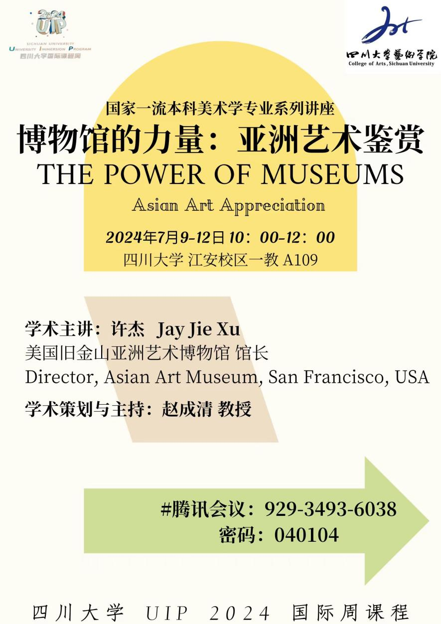 四川大学艺术学院开设国家一流本科美术学专业系列讲座,邀请来自世界一流大学的专家学者、学生到校开展课程教育与文化交流,助力川大学子深入探索自己感兴趣的领域和问题,相互学习,共同进步。在四川大学2024年uip国际周之际,四川大学艺术学院邀请旧金山亚洲艺术博物馆馆长、美国人文与科学院院士许杰馆长带来“博物馆的力量:亚洲艺术鉴赏”课程。
