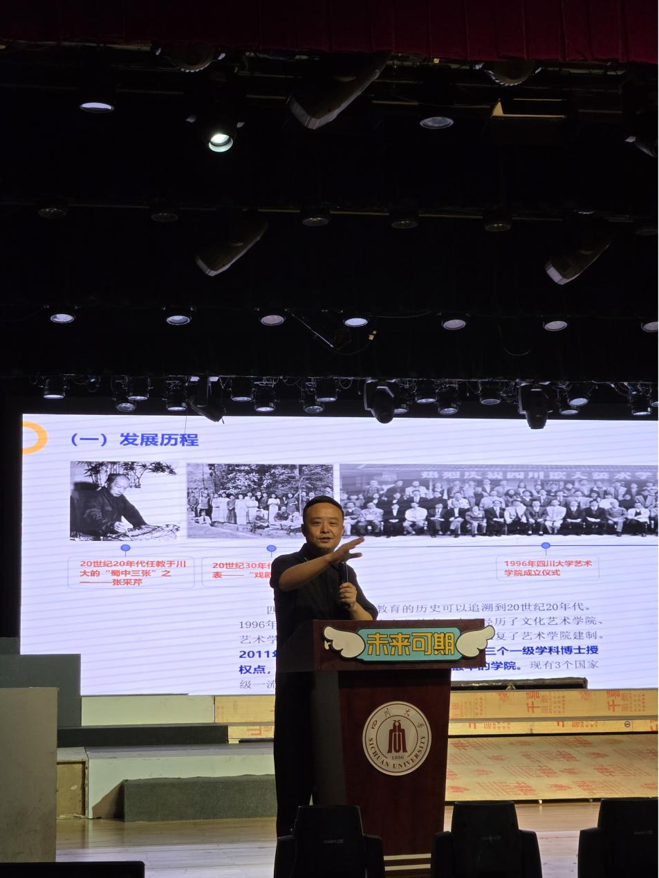 最后何院长强调我们大家都生活在他者包围的环境里,希望广大新同学要多交流。而作为当代大学生更应该肩负时代使命,以实现中华民族伟大复兴为己任,希望同学们在大学生活中树立远大理想,明确自己的奋斗目标和努力方向。“少年当有凌云志,万里长空竞风流”,大学生活是实现梦想的舞台,也是锻炼自我的机会。希望同学们在大学里不断磨砺自己,培养高瞻远瞩的见识与砥砺前行的意志,努力学好专业技能。未来将属于你们!至此,四川大学艺术学院开学第一课在热烈的氛围中结束,本次讲座为全院新生注入了信心和动力,使他们对未来充满了期待。在新的人生阶段,相信他们会在艺术的道路上越走越远,实现自己的梦想。