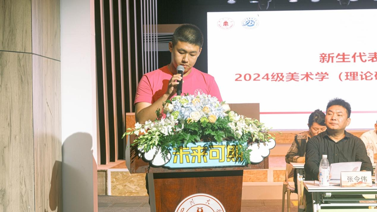 接着,2024级美术学理论专业汪轩正同学作为新生代表发言。他与同学们分享了自己进入大学生活后的几点期许,表达了对大学生活的展望和努力的决心。