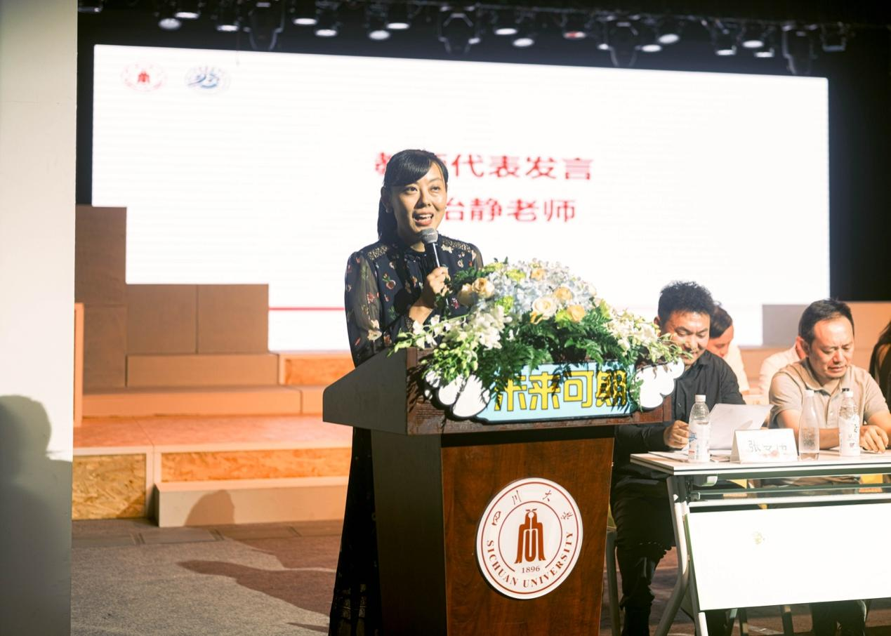 随后,杨怡静副教授作为教师代表发言。她代表全体老师热烈祝贺并欢迎新同学们来到四川大学艺术学院,面对即将开始的艺术之旅,乐在其中,拼搏其中。并寄语同学们在大学期间做到勤学善做,修身立德,志存高远。