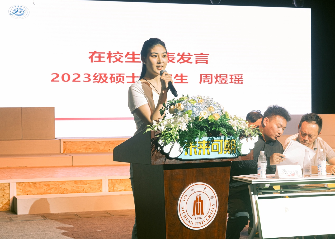 随后,2023级硕士研究生周煜瑶同学作为老生代表发言。她从自身经历出发,鼓励同学们用努力把握每一次机会,看到更加多元的学习方式。并向同学们提出几点建议:从被动学习转向主动学习、合理分配有限的时间和精力、勇于尝试抓住机会。