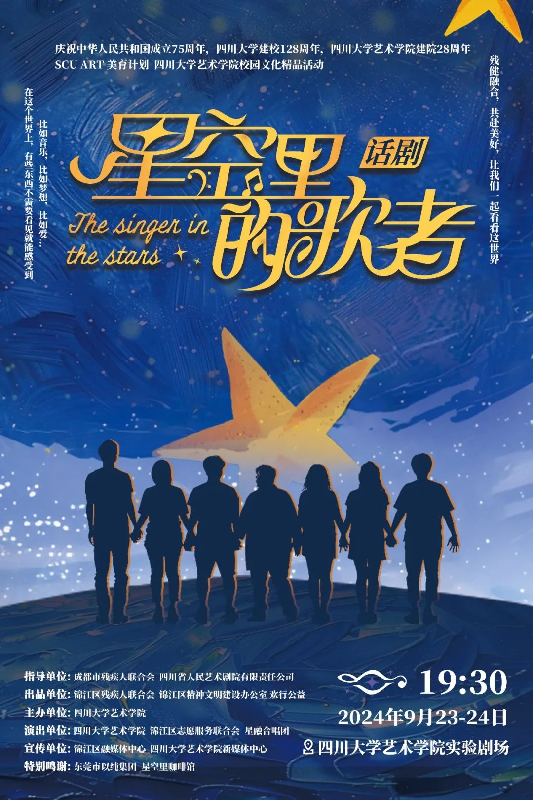 四川大学艺术学院联合四川省人民艺术剧院,与助残机构欢行公益、星空里咖啡“特需伙伴们”和高校文艺志愿者们一起,以志愿之力,点亮文艺之光,以满腔热情唱响时代主旋律,展现四川、成都、锦江区残健融合和谐发展的良好社会氛围,记录新时代下中国残疾人勇于追求“中国梦”的幸福美好生活。该剧主演主创均为四川大学艺术学院在校师生与校友,于9月23-24号晚19:30 在四川大学艺术学院教学实验剧场上演,敬请期待!