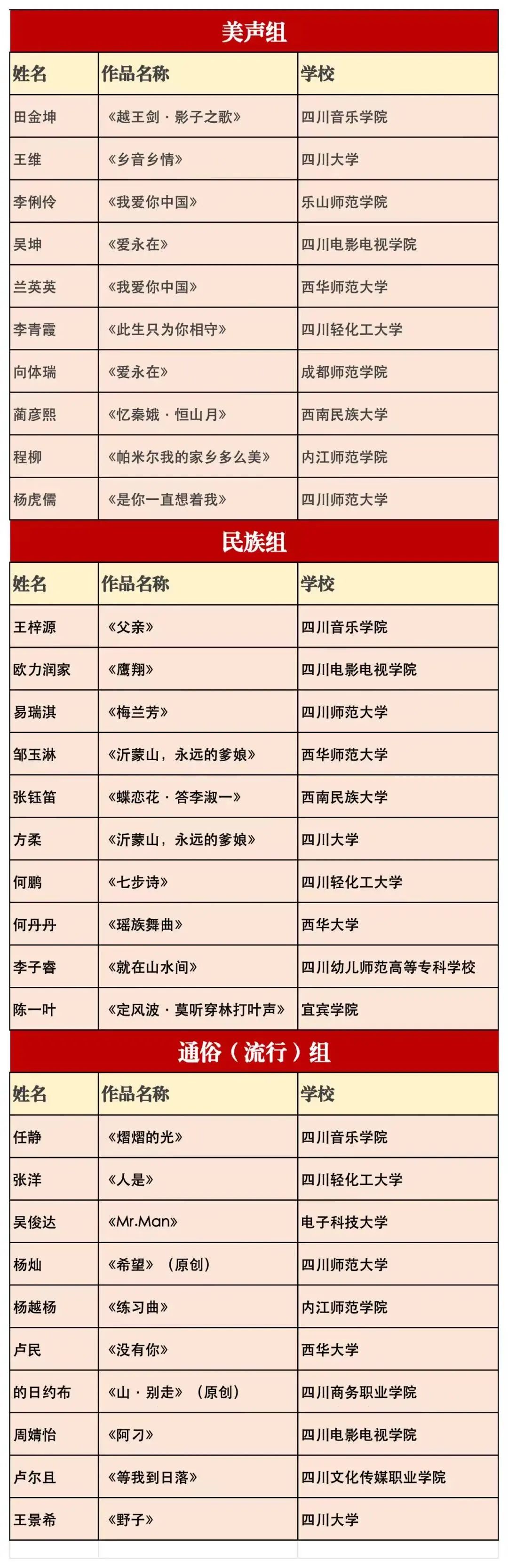 10月12日,由四川省教育厅主办,四川省教育融媒体中心(四川教育电视台)、四川音乐学院、四川轻化工大学承办的首届“苌弘杯”四川省高校校园歌手大赛总决赛在四川轻化工大学举行,经过3天总决赛比拼,我系学生王维(2021级音乐表演)、方柔(2023级音乐表演)、王景希(2023级音乐表演)分别荣获美声、民族、通俗(流行)三个组别的“十佳歌手”。