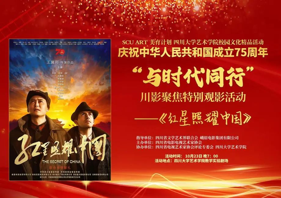 2024年是中华人民共和国成立75周年。75年来,在中国共产党的坚强领导下,中华民族完成了从站起来、富起来到强起来的伟大飞跃。为了全面贯彻落实党的二十大精神,学习宣传好习近平文化思想,四川大学艺术学院携手四川省电影电视艺术家协会,依托其惠民品牌“川影聚焦”主题观影活动,开展庆祝中华人民共和国成立75周年特别活动,精选“四川造”影片中的精品力作,用光影艺术展现新中国75年来社会经济生活等方面发生的巨大变化。本次观影分享会也是艺术党课“领略红色经典,重温辉煌历程——艺术中前行的中国”第九讲,重温红色经典,回顾峥嵘岁月。本期“与时代同行”川影聚焦特别观影活动在艺术学院教学实验剧场放映电影《红星照耀中国》。艺术学院将送出300张门票,请扫码参与抽奖(限川大师生)。中奖者请于2024年10月23日(周三)18:00—19:00到艺术学院教学实验剧场凭中奖信息领取门票。