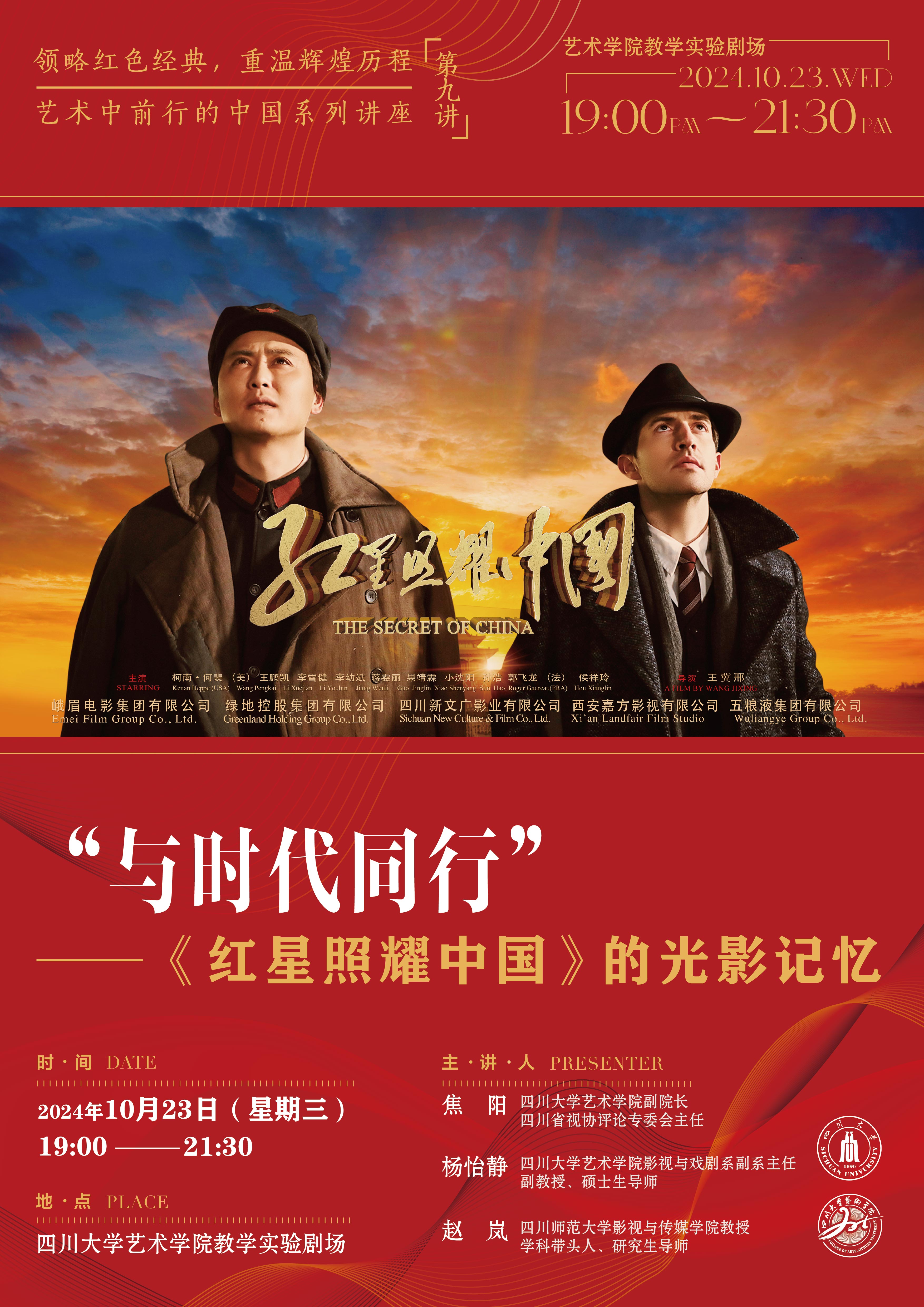 2024年10月23日晚,在庆祝中华人民共和国成立75周年的热潮中,四川大学艺术学院携手四川省电影电视艺术家协会,顺利举行以“传承红色基因,赓续革命精神”为主题的“与时代同行”川影聚焦特别观影活动——《红星照耀中国》。此次活动旨在通过光影艺术,加强对大学师生的爱国主义教育,让红色基因在新时代焕发新的活力。本次观影分享会也是艺术党课“领略红色经典,重温辉煌历程——艺术中前行的中国”第九讲,重温红色经典,回顾峥嵘岁月。