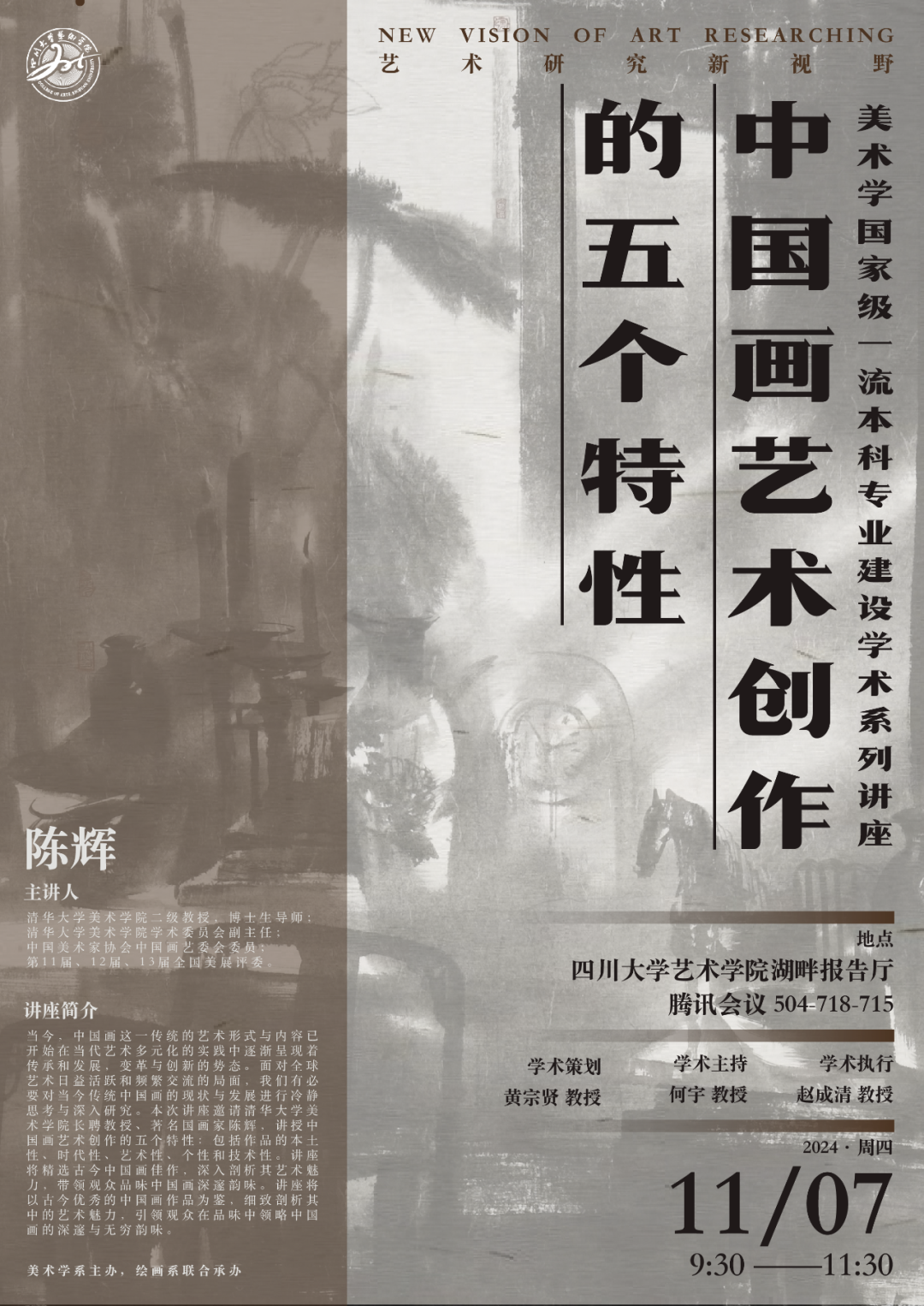 今天,中国画这一传统的艺术形式与内容已开始在当代艺术多元化的实践中逐渐呈现着传承和发展,变革与创新的势态。面对全球艺术日益活跃和频繁交流的局面,我们有必要对当今传统中国画的现状与发展进行冷静思考与深入研究。本讲座特邀清华大学美术学院长聘教授、著名国画家陈辉,讲授中国画艺术创作的五个特性,包括作品的本土性、时代性、艺术性、个性和技术性。首先,作品将强调作品的本土性,它是民族文化的根基,只有源自生活和自然的灵感,才能真正打动观众;其次,作品的时代性反映了特定历史背景下的艺术特征,创新在其中不可或缺;第三,艺术性通过文化内涵和美学价值观展现作品的深度,艺术家的格调与品位则是其艺术价值的标志;第四,个性彰显了原创性与创新的重要性,实验精神为艺术注入了新生命;最后,技术性作为艺术表现的支撑,决定了作品的艺术格调和意境。讲座将以古今优秀的中国画作品为鉴,细致剖析其中的艺术魅力,引领观众在品味中领略中国画的深邃与无穷韵味。