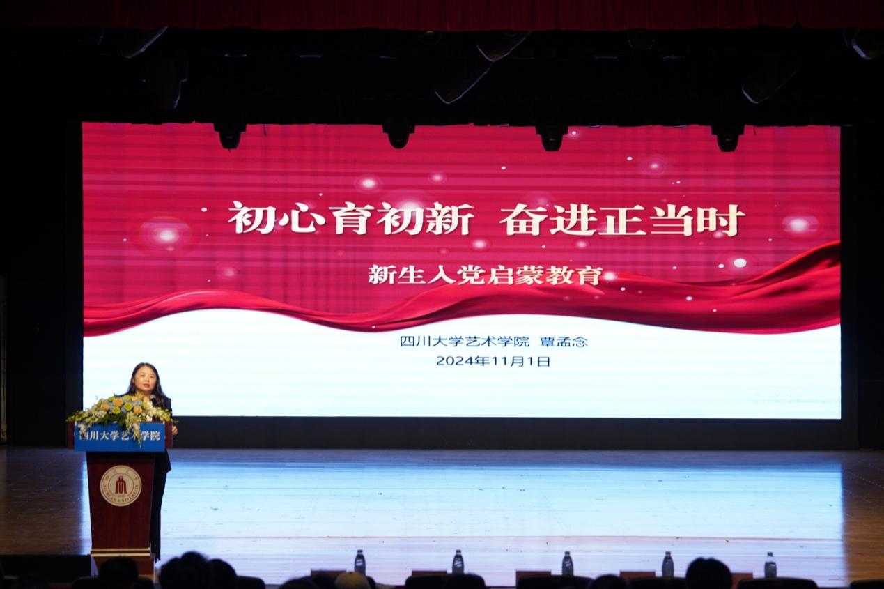 为进一步践行“为党育人,为国育才”的初心使命,引导广大新生坚定理想信念,增强社会责任感,积极向党组织靠拢,2024年11月1日下午,四川大学艺术学院党委书记覃孟念老师在艺术学院艺术小剧场为2024级新生上了一堂题为《初心育初新,奋进正当时》的思政课,对全体新生进行了一次入党启蒙教育。