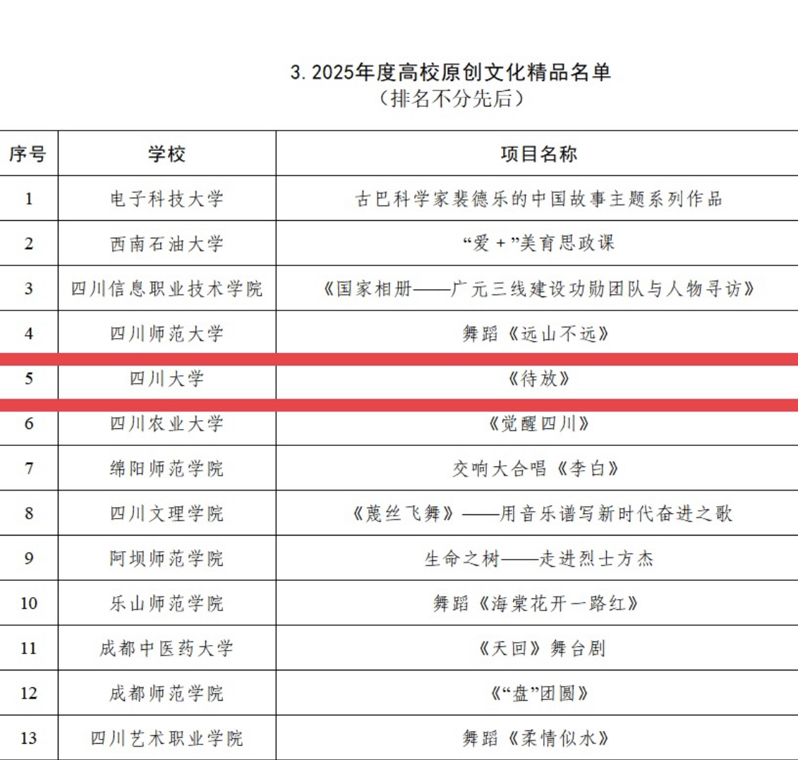 近日,四川省教育厅发布了《四川省教育厅关于2025年度四川省高校思想政治工作质量提升综合改革与精品建设项目入选名单的公示》,学院舞台剧《待放》项目成功获批2025年度省高校思想政治工作质量提升综合改革与精品建设项目立项,入选2025年度高校原创文化精品名单,这是对学院思政育人工作的又一肯定。
