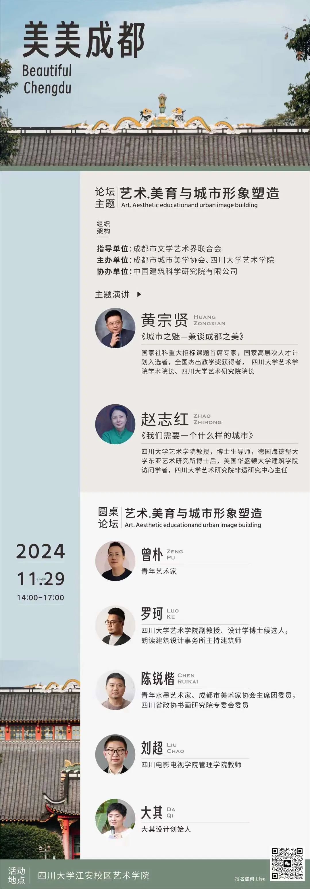 成都,这座拥有悠久历史和丰富文化的城市,更是将文化视为城市的灵魂。为了弘扬中华文明,发展天府文化,加快建设世界文化名城,深入挖掘天府文化的深刻内涵和丰富资源,滋养理论武装、思想建设和文明风尚,用科学理论武装人,用天府文化陶冶人,用城市精神塑造人,以培育社会主义核心价值观,不断增强天府文化的凝聚力和引领力,将于2024年11月29日下午,在四川大学江安校区艺术学院湖畔报告厅举办“艺术.美育与城市形象塑造”专题论坛。