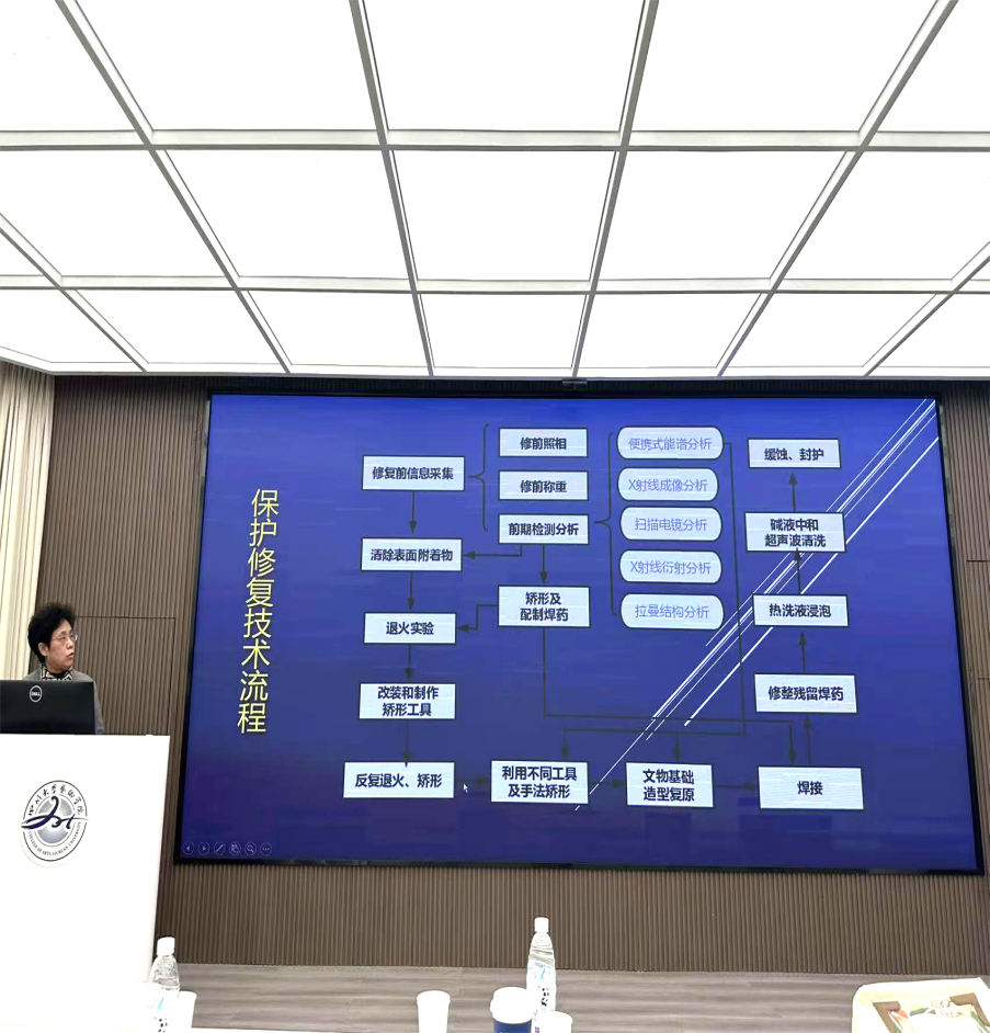 讲座伊始,马老师简要介绍了题目缘起,“被迫离尘去”暗指中国古代厚葬文化中掩埋3000余年的广汉市三星堆遗址以及水下埋藏300余年的眉山市江口明末古战场遗址,它们历经新一期的考古发掘,出土文物8万余件,其中金银质文物宥待科学的认知、修复与保护,经由科技手段而“归来亦芳华”,得以向世人展示金银质文物流光溢彩的风貌。首先,马老师对比了常规的田野考古现场,引入其从事的考古发掘的新方法与新技术。三星堆的新发掘及其金质文物出土的现场保护是在1986年挖掘的基础上,更为精准地监测、调节了空气环境、土壤环境、光照强度等因素对其的影响。通过离子色谱和分析x射线探伤,以检测附着土中腐蚀性酸根离子对文物的损害,并进一步探讨金银质文物内部结构及制作工艺的特征。江口水域围堰考古发掘作为世界水下考古的一项创举,从2017年至2023年底间进行的5次考古发掘工作,累计发现出水文物7万余件。马老师简要介绍了江口水域航空考古的位置,rtk体系的全程定位以及每一年围堰范围的叠加,并梳理了修复出土文物的技术流程。最后,关于文物修复的内涵,马老师从金银质文物精美的制作工艺为切入点,探讨了从唐宋至今,中国传统文化中金银首饰的样态和细金工艺的传承与流变。