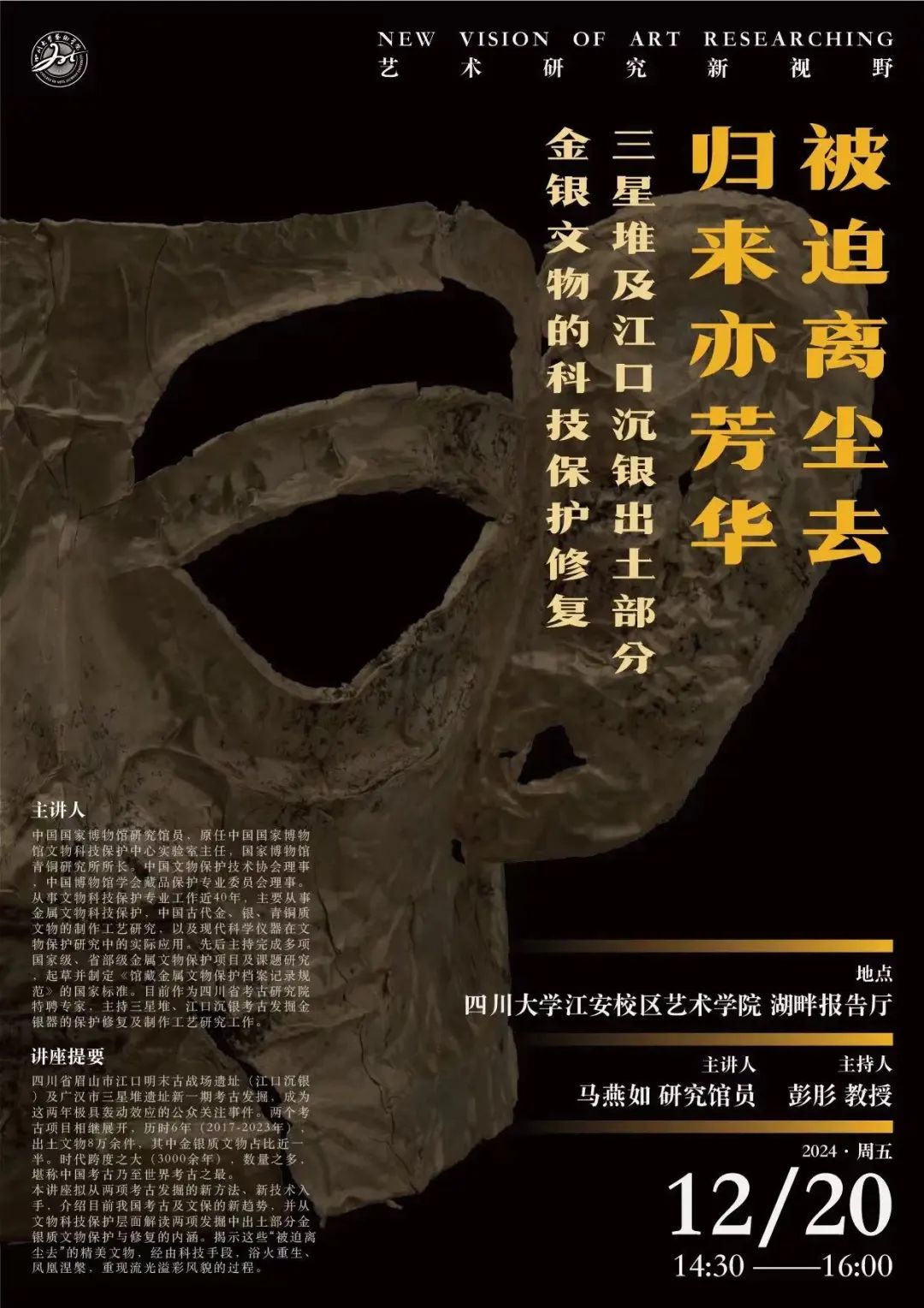 2024年12月20日下午,“艺术研究新视野”系列学术讲座:被迫离尘去,归来亦芳华——简述三星堆及江口沉银出土部分金银文物的科技保护修复讲座于四川大学艺术学院湖畔报告厅举办。本次讲座邀请中国国家博物馆研究馆员,原任中国国家博物馆文物科技保护中心实验室主任,国家博物馆青铜研究所所长,中国文物保护技术协会理事,中国博物馆学会藏品保护专业委员会理事马燕如老师主讲,艺术学院博士生导师彭肜教授主持讲座。