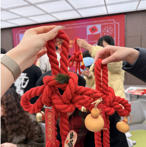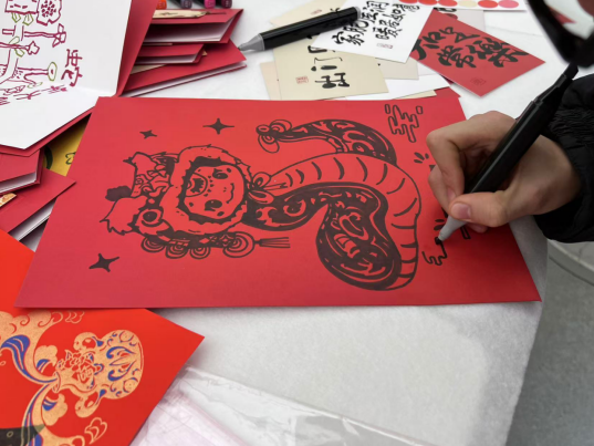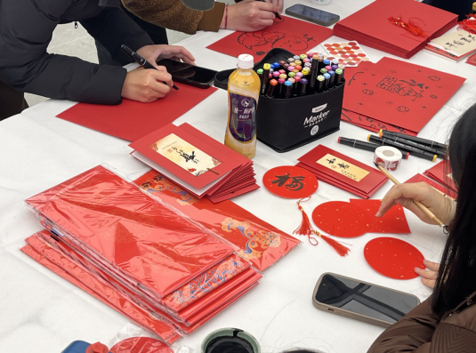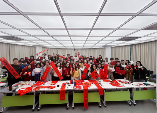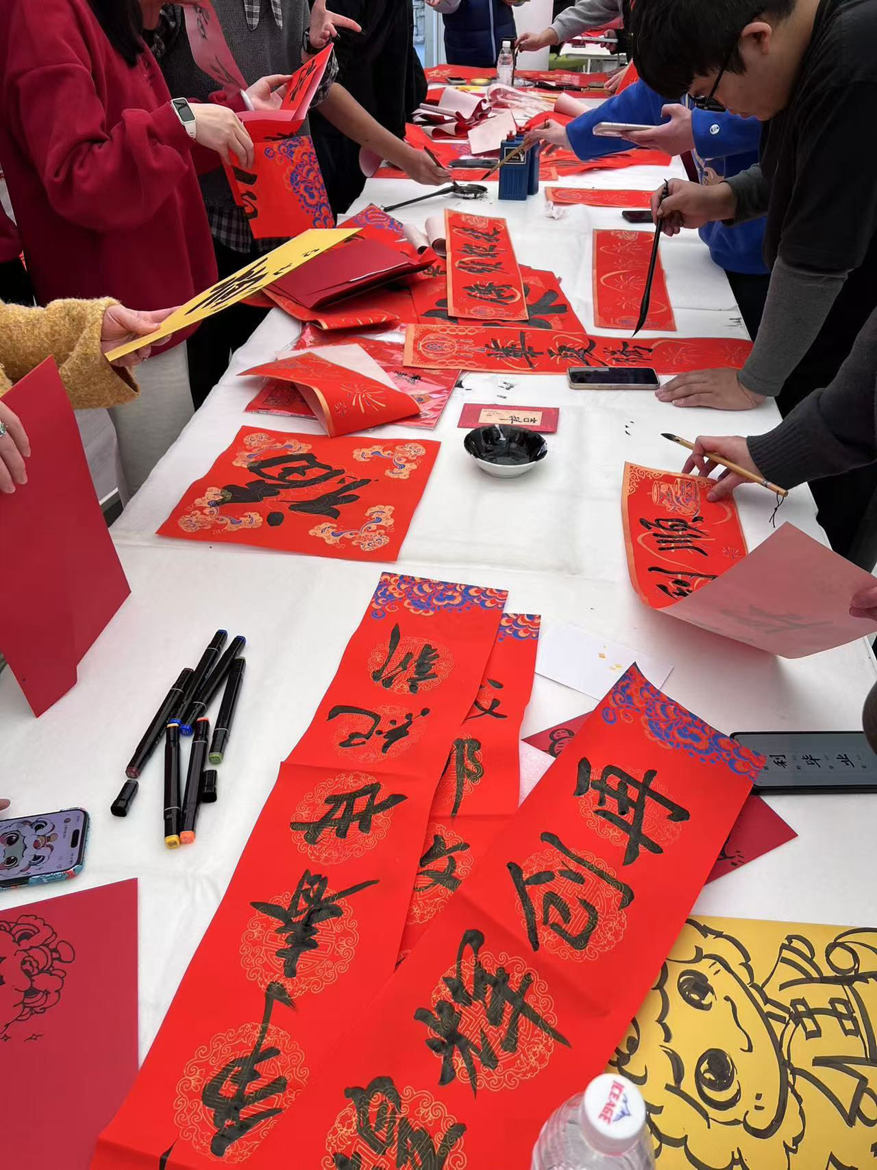 下午2点,活动准时开始,气氛温馨。学生们围坐在一起,用心地撰写春联、绘制贺卡、编制中国结。一笔一墨彰显书法魅力,一纸一砚谱写美好愿景,不仅展示了学生们的创造力和艺术才能,也体现了大家对传统文化的尊重和传承。行书、隶书、草书等各种字体、各种形式的春联,既有辞旧迎新的喜悦,又饱含着新的一年的祝福,充满浓浓的年味。