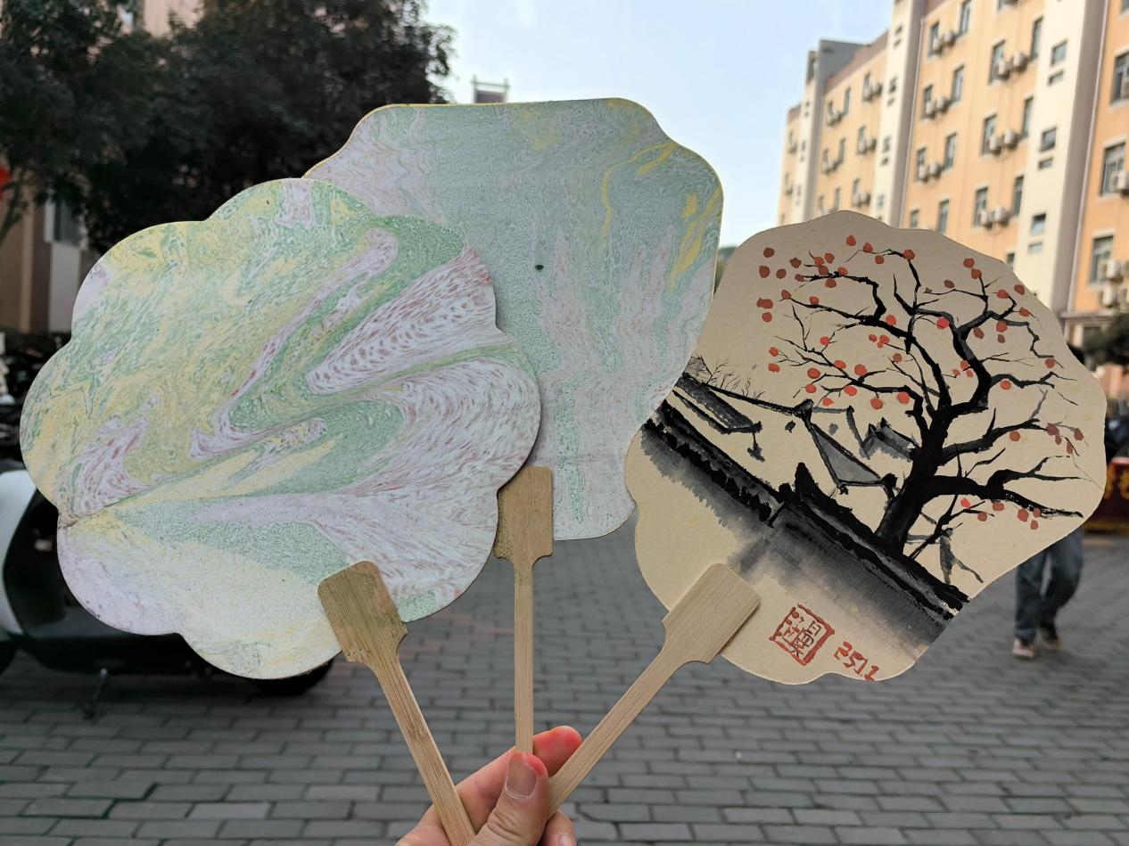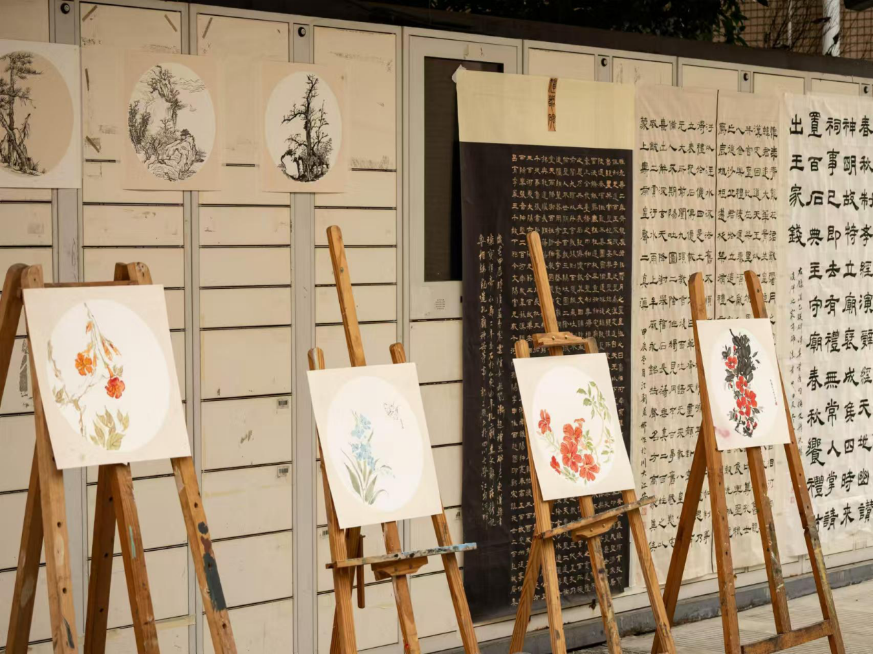 活动二:“扇面古画”。同学们在国画专业同学的指导下,学习中国画的笔墨技法,绘制山水、花鸟等扇面作品,体验传统绘画艺术的精深。一幅幅精美的扇面作品展现了同学们的艺术才华和对传统文化的热爱。
