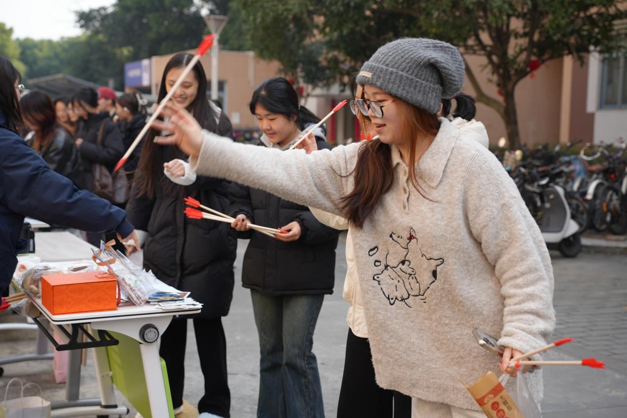 活动七:“新年投壶”。活动现场,同学们手持箭矢,站在壶前,聚精会神地瞄准目标。每一次投中壶中,都引来周围同学的欢呼和掌声。投壶游戏不仅考验了同学们的投掷技巧,还增强了彼此之间的交流和互动。