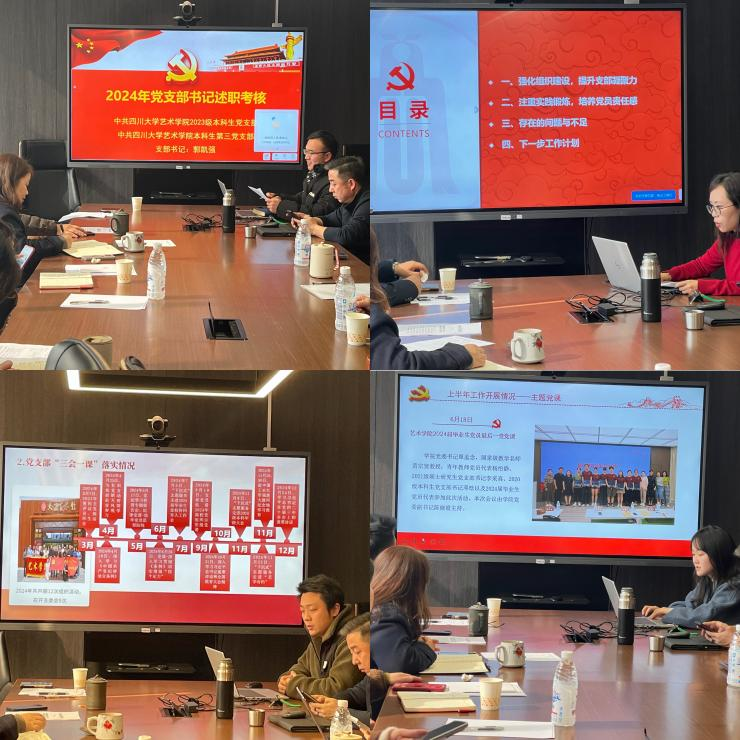 覃孟念书记对党支部书记的述职情况进行了全面总结,她充分肯定了各支部长期以来的扎实工作,就现有工作存在的差距和问题提出了意见。她提出三点要求:一是深化理论武装,提高政治站位,各支部要继续深入学习贯彻党的二十届三中全会精神和全国教育大会精神,确保党的教育方针政策得到全面贯彻落实;二是推动党建工作与业务工作有机融合,以“红色+艺术n”为抓手,凝聚共识、形成合力,用高质量党建引领各项工作高质量发展;三是凝练品牌特色,提升工作实效,通过“一支部一品牌”特色活动,各党支部结合自身特点,打造具有特色的党建品牌,增强支部的凝聚力和影响力。