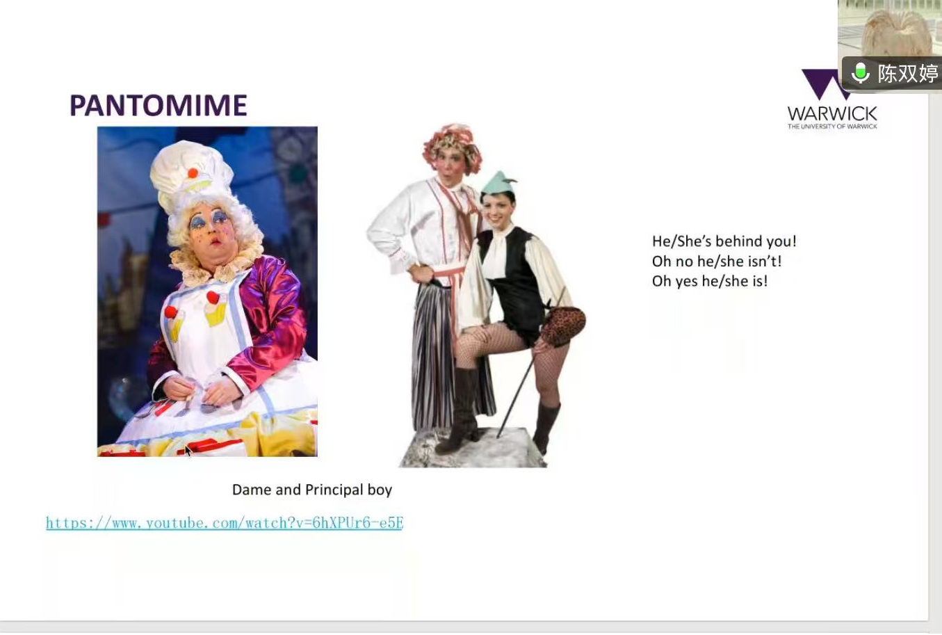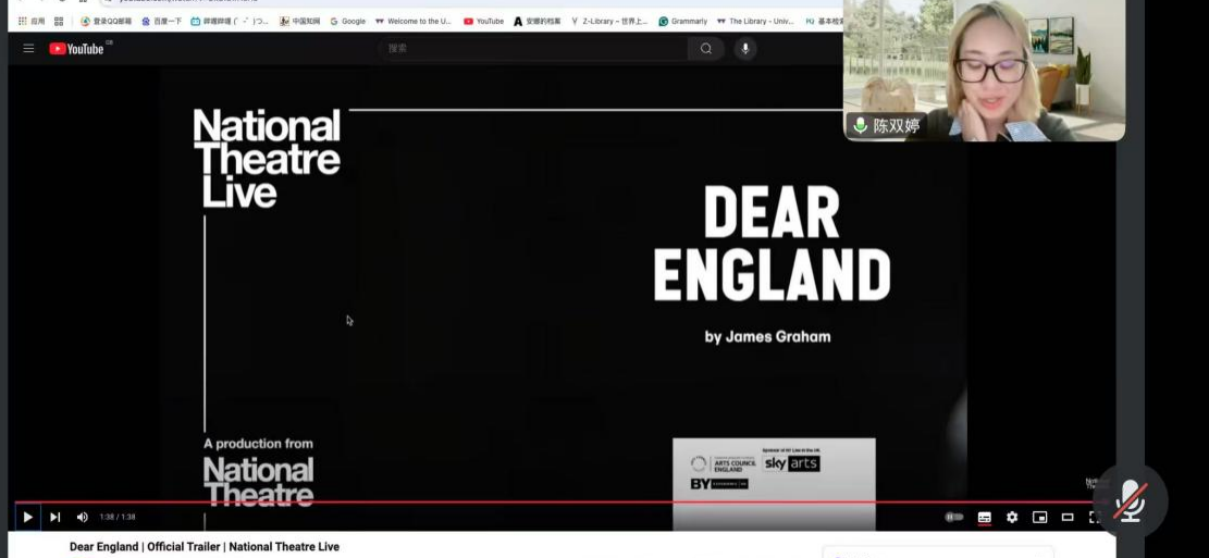 会上,陈老师首先分享了西方戏剧地冲突与处理,从戏剧导演、剧场作品、演出趋势三个方面出发带领同学们欣赏剧目视频,并结合由三位演员担任作品艺术总监的案例作详细分析。随后,陈老师从《等待戈多》、《仲夏夜之梦》等具体剧目入手,阐释了英国不同剧种对经典作品的演绎。在问答环节,陈老师细心解答同学们的疑惑,分享了自己的专业成长路径和在华威大学求学时的经历与收获,并对华威大学的教学方式进行了简要介绍。陈老师谈到,在学习戏剧艺术的过程中要有足够的热爱,正是这份热爱让她在戏剧学的研究中更加纯粹。陈老师结合自身的留学实践感悟,展开对当下戏剧在时代艺术创作中的中西方文化交融,以及求学者在科研中的自我突破与和解进行了探讨。