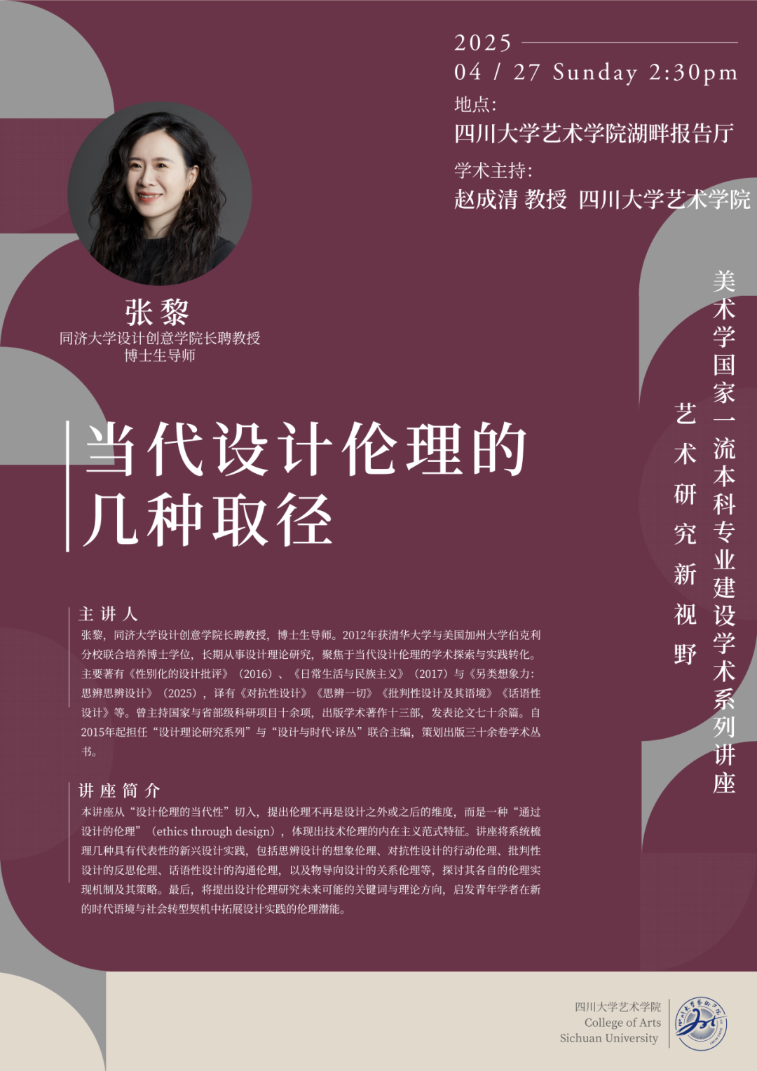 当代设计伦理呈现出多重取径与范式转换的趋势。本讲座从“设计伦理的当代性”切入,提出伦理不再是设计之外或之后的维度,而是一种“通过设计的伦理”(ethics through design),体现出技术伦理的内在主义范式特征。讲座将系统梳理几种具有代表性的新兴设计实践,包括思辨设计的想象伦理、对抗性设计的行动伦理、批判性设计的反思伦理、话语性设计的沟通伦理,以及物导向设计的关系伦理等,探讨其各自的伦理实现机制及其策略。最后,将提出设计伦理研究未来可能的关键词与理论方向,启发青年学者在新的时代语境与社会转型契机中拓展设计实践的伦理潜能。