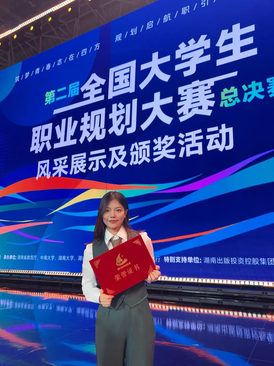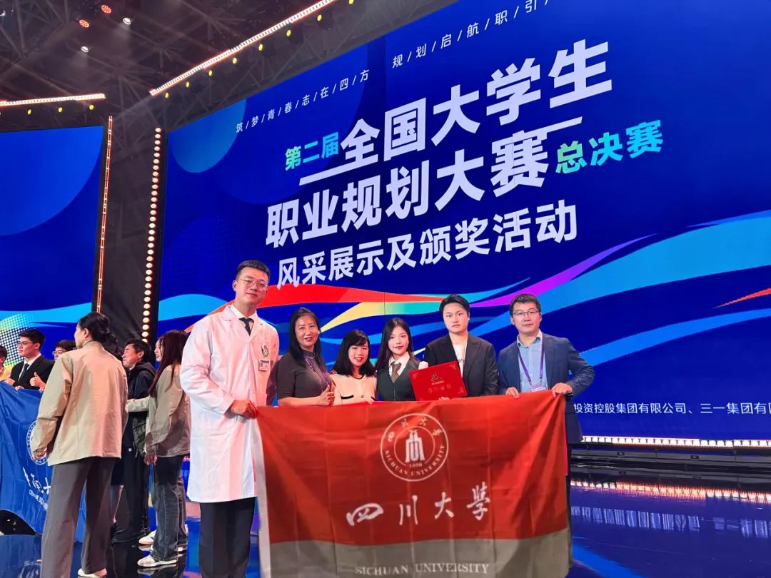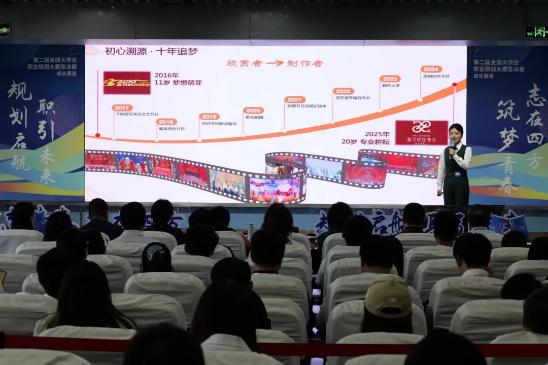 2025年4月16日至19日,由教育部主办的第二届全国大学生职业规划大赛在长沙落下帷幕。全国共有2763所高校的1507万名学子报名参赛,经过校赛、省赛的层层选拔,最终700余名选手晋级全国总决赛。大赛分设“成长赛道”“就业赛道本科生组”“就业赛道研究生组”三大组别,通过职业目标规划、实践成果展示、综合能力答辩等环节,全面考察选手的职业认知、专业素养与创新能力。中央广播电视总台《新闻联播》对该赛事进行了报道。四川大学艺术学院2023级广播电视编导专业马清楠荣获四川省大学生职业规划大赛成长赛道省级金奖,2022级视觉传达设计专业刘亦航荣获四川省大学生职业规划大赛成长赛道省级银奖。马清楠作为我校在成长赛道的种子选手入围全国总决赛,充分展示出我校学生执着梦想、深耕专业、追求卓越的昂扬风采,最终斩获第二届全国大学生职业规划大赛全国总决赛银奖。