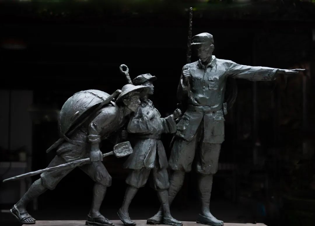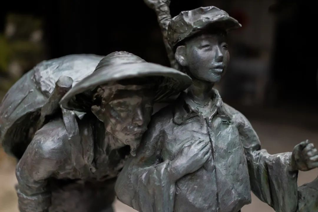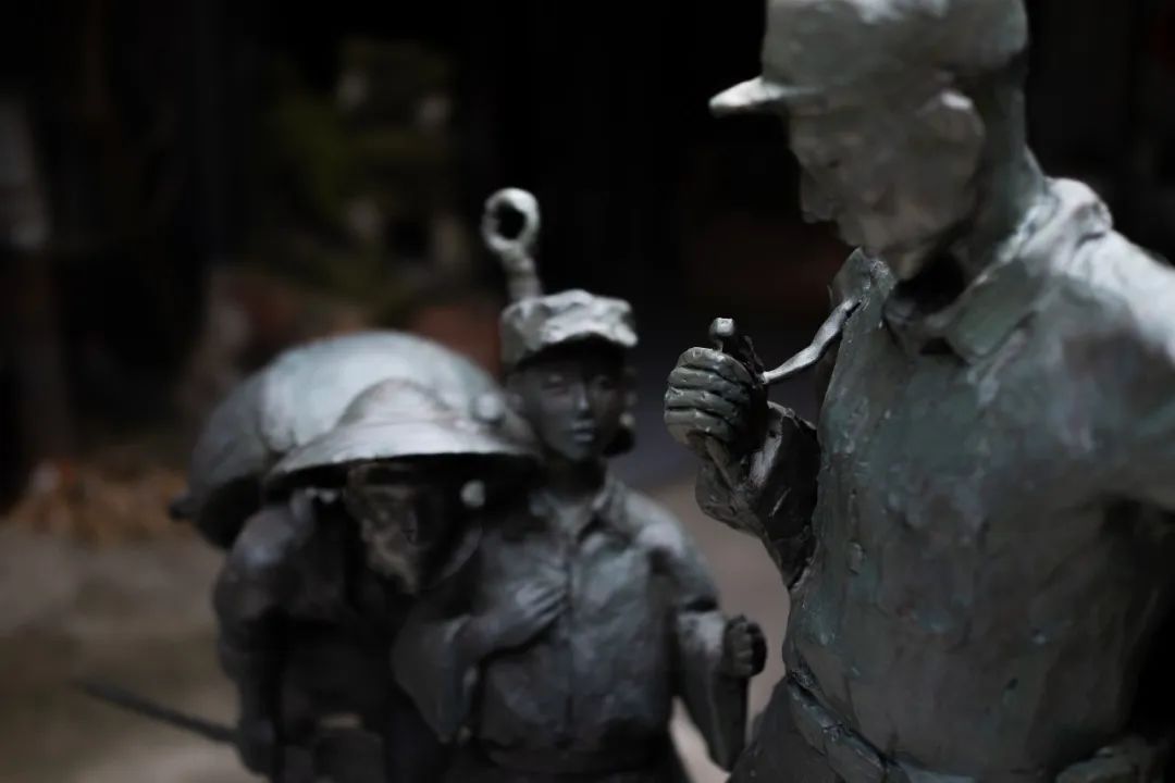 《壮士出川系列1—— 上阵父子兵》的创作基于川军档案、文物图像及口述史料,考证川军步枪膛线弧度、斗笠编织工艺、绑腿技法等物质细节,让雕塑成为可触摸的战争标本;通过三维扫描建川博物馆藏川军文物,结合运动力学分析优化雕塑动态比例,使人物姿态符合解剖学逻辑又具叙事张力;将川渝抗战老兵后代口述的 “行军途中以竹筒煮野菜充饥”“夜宿时斗笠覆面避雨” 等生命细节,转化为青铜表面的微观史诗。
