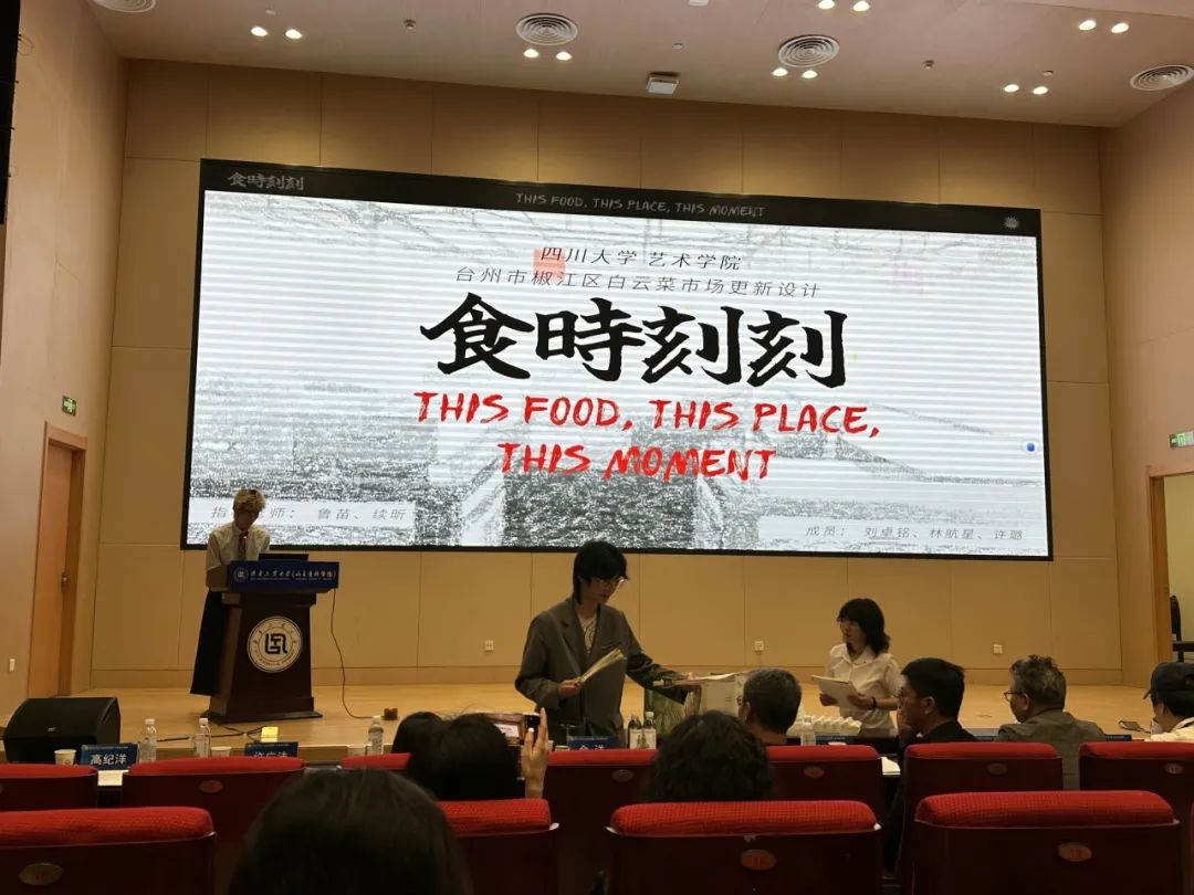 此次联合毕业设计活动由环境设计系鲁苗、续昕两位指导教师带队,刘卓铭、林航星、许璐三位应届毕业生组队参加毕业创作。在最终答辩现场,三位川大学子凭借扎实深厚的专业功底、极具前瞻性的创新设计理念,以及沉稳出色的临场表达,向与会专家和兄弟院校师生充分展现了川大环境设计专业学子的良好专业素养与优质教学成果。其作品《食时刻刻 —— 台州市椒江区白云菜市场更新设计》(命题设计),以独特的视角和创新的设计思路,赢得评审专家的一致高度赞誉并取得全场最高分。