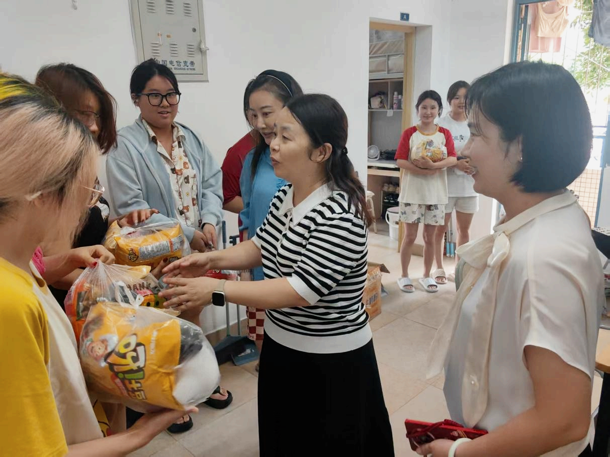 秋高气爽,迷彩整齐。为深入了解2025级新生军训期间的生活适应情况,传递学院温暖,9月16日中午,艺术学院党委书记覃孟念、院长何宇、党委副书记陈晓霞、副院长焦阳、副院长张令伟,2025级本科生辅导员及“青锋”学长团队一同走进新生寝室,看望军训的同学,并发放慰问物资。