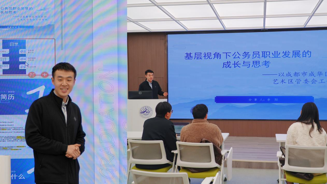 随后,分享会转向基层实践的广阔天地。2020届景观设计专业硕士毕业生、现任成都市成华区东郊记忆艺术区管理委员会综合管理部部长的李阳,带来了题为“基层视角下公务员职业发展的成长与思考”的专题分享。李阳结合其自考入成华区委组织部后,历经区委办、产业功能区、驻村第一书记等多岗位锻炼的丰富履历,以生动的一线案例,讲述了他在城市建设、园区发展、乡村振兴等工作中的实践与思考。他分享了从校园到机关的角色转变心得,阐述了在基层工作中对公务员职业价值的深刻理解,其真实的成长故事与务实的人生思考引发了在场同学的强烈共鸣。