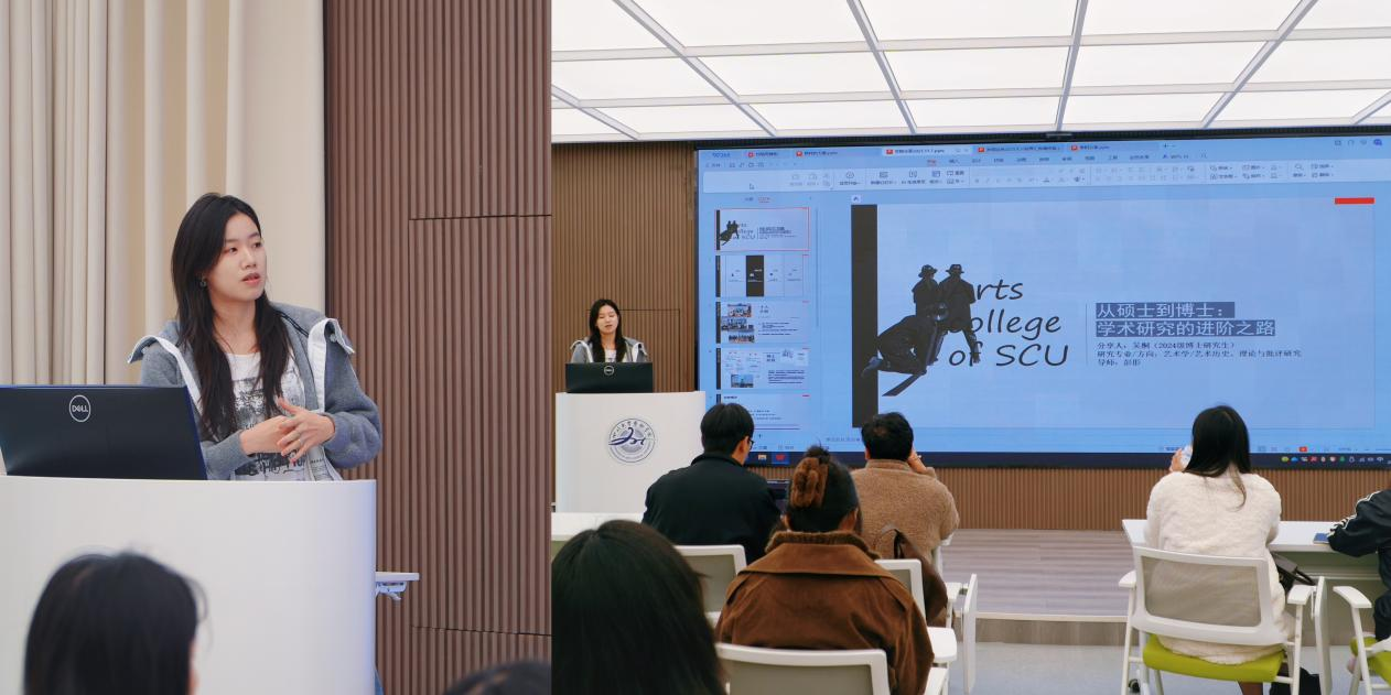分享会首先在学术研究的深度探索中拉开帷幕。艺术学院在读博士研究生吴桐以“从硕士到博士:学术研究的进阶之路”为题,结合自身科研经历,深入剖析了学术道路上的关键抉择与核心能力的培养。她围绕研究方向的选择、科研瓶颈的突破、学习与研究的平衡等同学们关切的问题,分享了宝贵经验,为有志于学术深造的同学提供了清晰的路线图。
