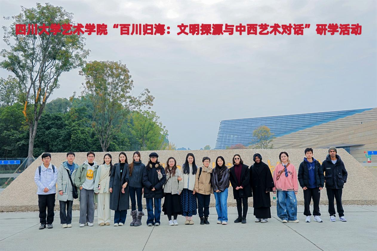 2025年11月21日,四川大学艺术学院组织本硕博中外学子,在硕士研究生第一党支部书记苑雨萌老师与发展规划科胡听汀老师的带领下,赴广汉三星堆博物馆开展“百川归海:文明探源与中西艺术对话”研学活动。通过实地考察,深入探寻古蜀文明脉络,展开跨文明艺术对话。