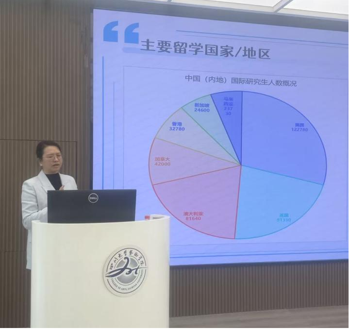 2025年12月12日下午,四川大学艺术学院“川流入海”国际交流系列宣讲第十一期:《全球学术视野下研究生教育新图景——海外申研全景策略与进阶指南》在江安校区湖畔报告厅如期举行。宣讲会由british council 雅思官方顾问ying huang主讲,学院副院长焦阳主持,来自不同专业的同学们参加了本次讲座。