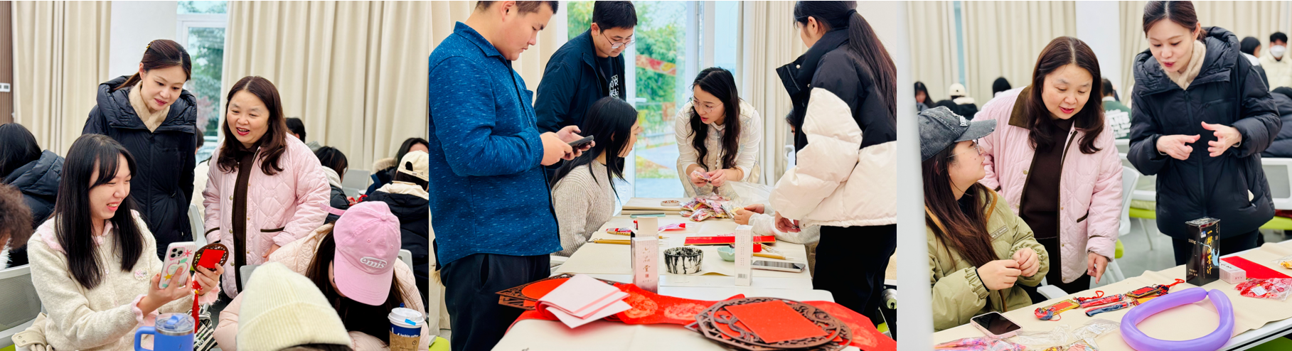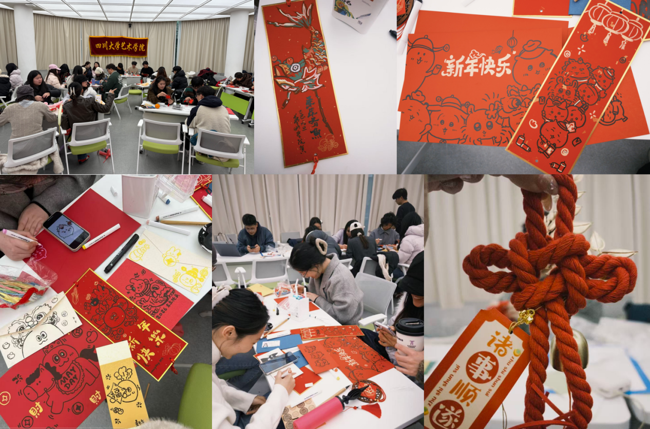 一旁的“凝心·传情”贺卡挂件制作区同样气氛热烈。彩纸、中国结、各式装饰材料琳琅满目。同学们充分发挥艺术设计与创意,巧手折叠、精心拼接,将浓浓的新春祝福注入独一无二的贺卡和挂件中,尽显温情与创意。