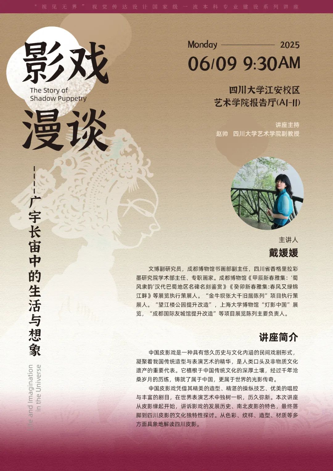 中国皮影戏是一种具有悠久历史与文化内涵的民间戏剧形式,凝聚着我国传统造型与表演艺术的精华,是人类口头及非物质文化遗产的重要代表。它植根于中国传统文化的深厚土壤,经过干年沧桑岁月的历练,铸就了属于中国,更属于世界的光影传奇。中国皮影戏凭借其精美的造型、精湛的操纵技艺、优美的唱腔与丰富的剧目,在世界表演艺术中独树一帜,历久弥新。本次讲座从皮影缘起开始,讲诉皮影戏的发展历史、南北皮影的特色,最终落脚到四川皮影的文化独特性探讨。从色彩、纹样、造型、材质等多方面具象地解读四川皮影。