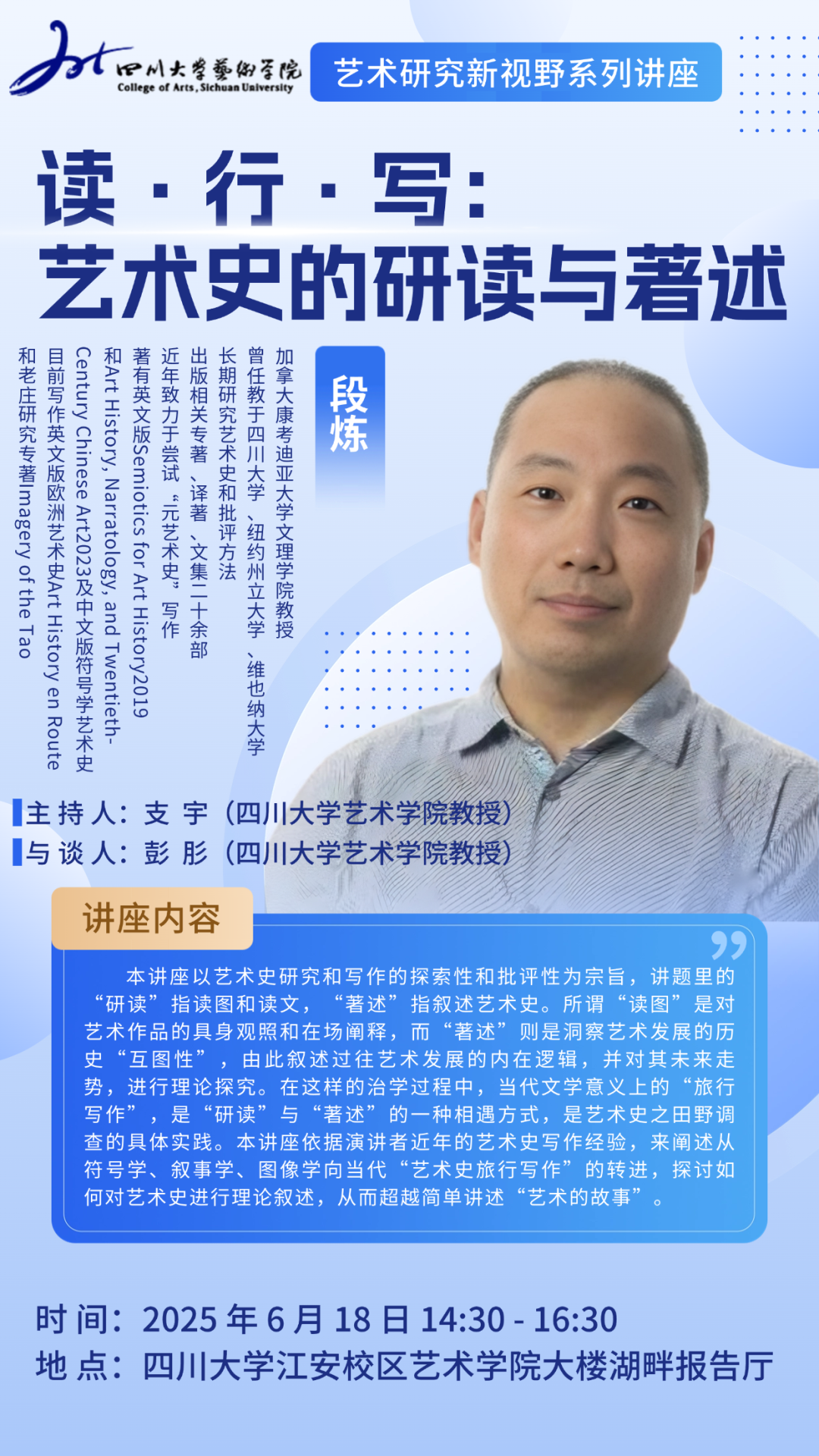 段炼,加拿大康考迪亚大学文理学院教授,文学理论博士、美术教育学博士,曾任教于四川大学、纽约州立大学、维也纳大学,长期研究艺术史和批评方法,出版相关专著、译著、文集二十余部,近年致力于尝试“元艺术史”写作,著有英文版semiotics for art history(2019)和art history, narratology, and twentieth-century chinese art(2023)及中文版《符号学艺术史》,目前写作英文版欧洲艺术史art history en route和老庄研究专著imagery of the tao。
