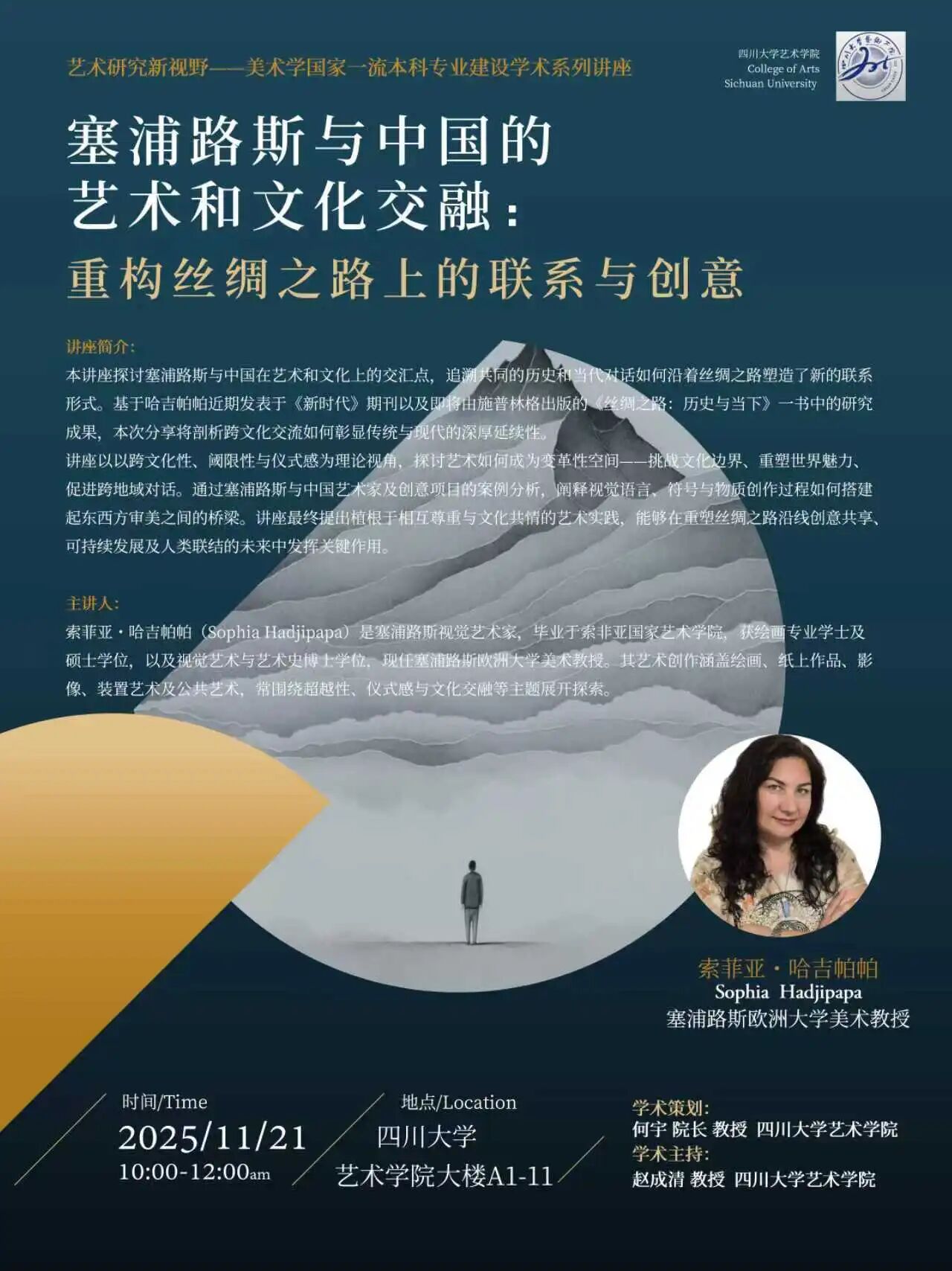 2025年11月21日上午,由四川大学艺术学院主办,四川大学艺术学院院长何宇教授策划的“艺术研究新视野——美术学国家一流本科专业建设学术系列讲座”《塞浦路斯与中国的艺术和文化交融:重构丝绸之路上的联系与创意》在艺术学院大楼a1-11顺利举办。本次讲座特邀塞浦路斯欧洲大学美术教授、视觉艺术家索菲亚·哈吉帕帕(sophia hadjipapa)担任主讲。讲座由四川大学艺术学院艺术史系赵成清教授担任学术主持,学院本、硕、博学生参加了此次讲座。