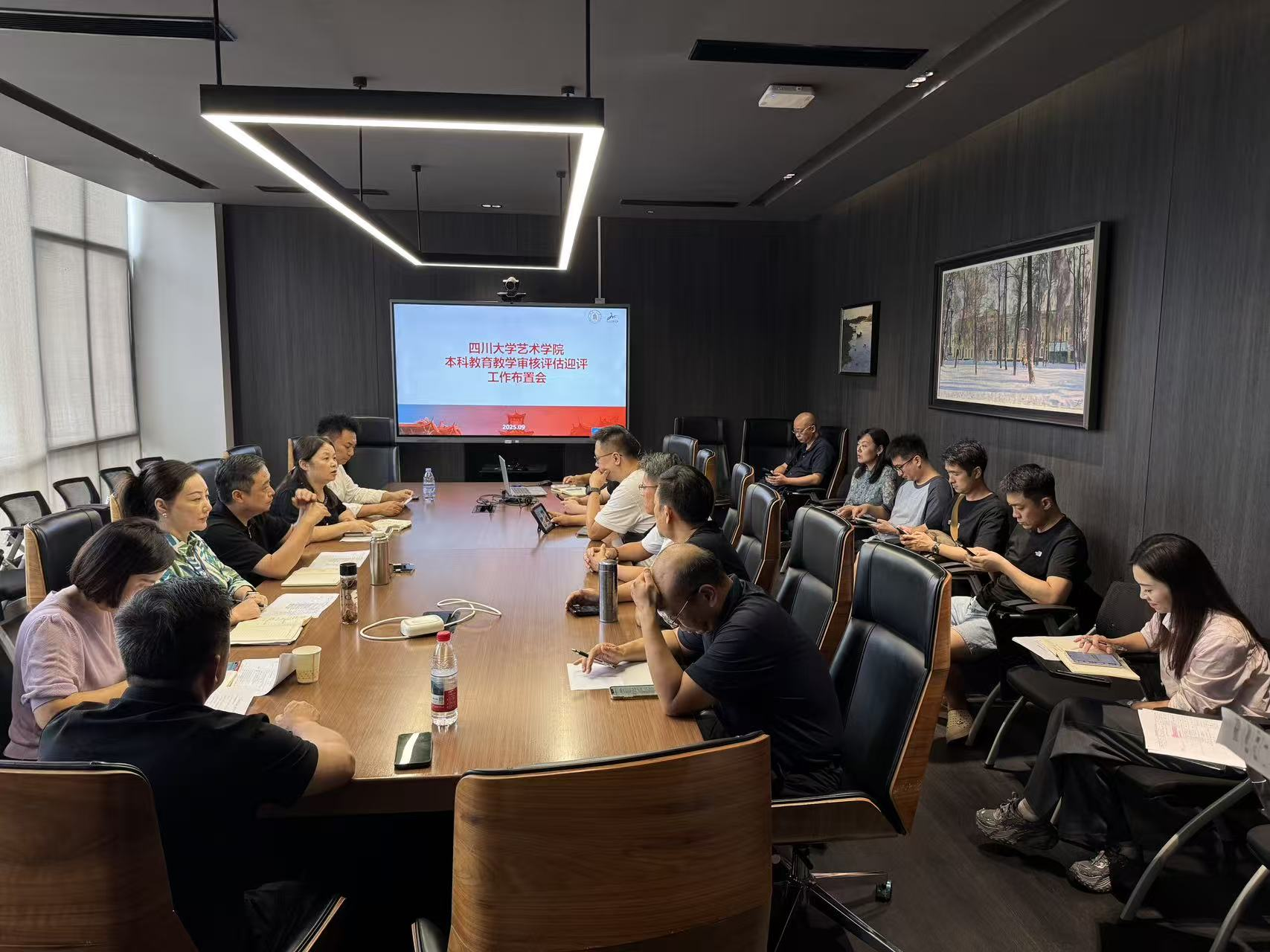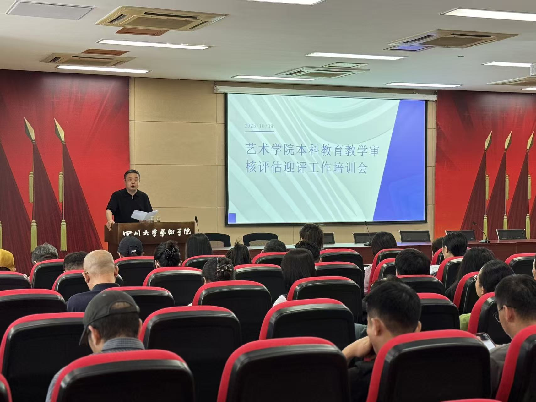 2025 年 10 月 9 日,四川大学艺术学院围绕本科教育教学审核评估迎评核心任务,先后召开工作布置会与专题培训会。学院党委书记覃孟念、院长何宇、教学副院长张令伟等全体领导统筹组织,全体教师参会,为迎评工作有序推进奠定基础。