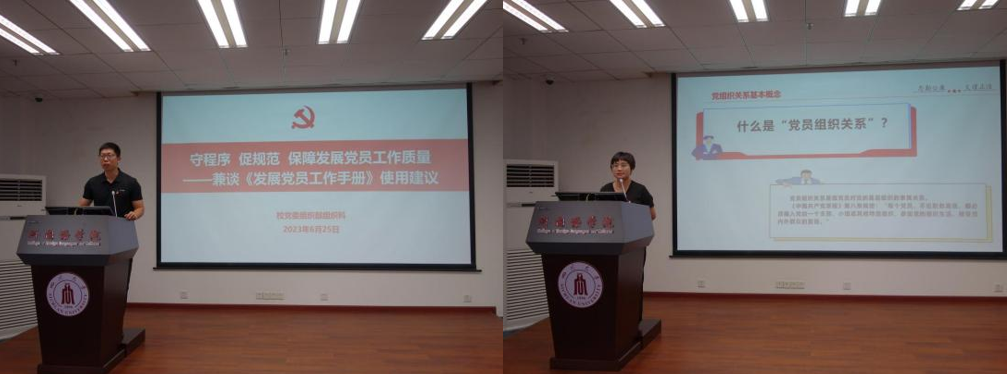 党委组织部组织科陈朝东以《守程序 促规范 保障发展党员工作质量》为题,详细讲解发展党员工作流程及容易出错的关键点,并介绍《发展党员工作手册》的使用建议。党委组织部综合科钟蕊霜以《2023年毕业生党员组织关系转接实务交流会》为题,围绕毕业生党组织关系转接等党务工作作了详细说明。