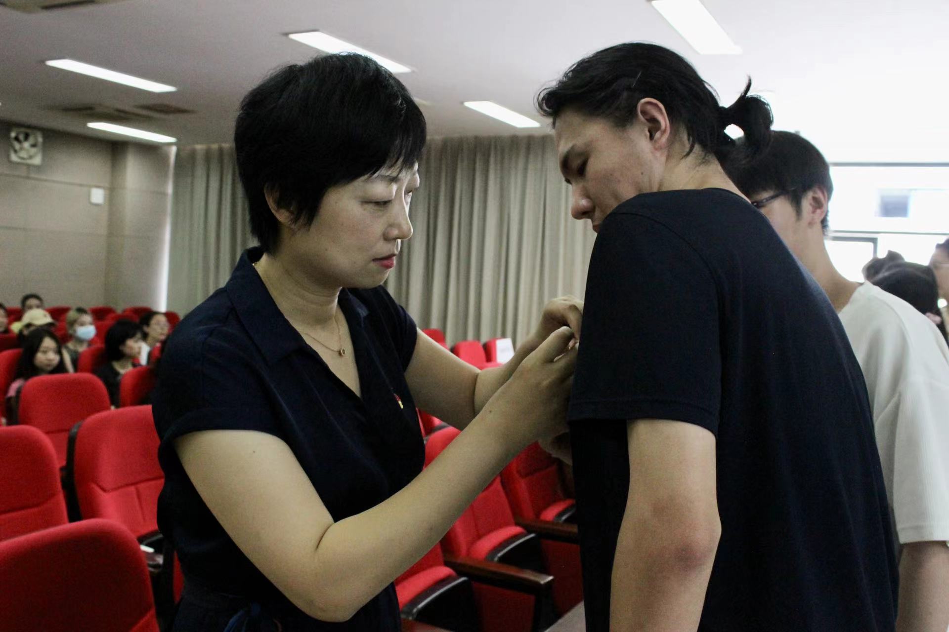 仪式上,由教师党员、学生正式党员为近期46名新发展党员佩戴党徽。佩戴党徽,既亮明身份又起到警示作用,增强了党员的荣誉感和责任感,使党员同志时刻牢记自己是一名共产党员,时刻践行全心全意为人民服务的根本宗旨。熊伟书记对新发展党员表示祝贺,强调新党员一定要恪守入党誓词,牢记理想信念,发挥党员先锋模范作用。